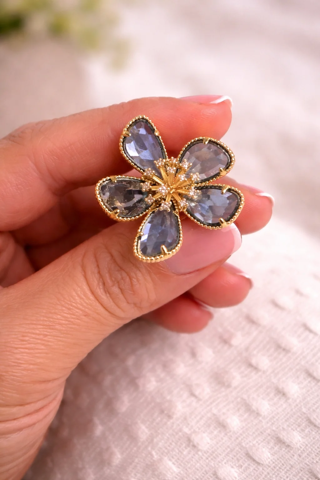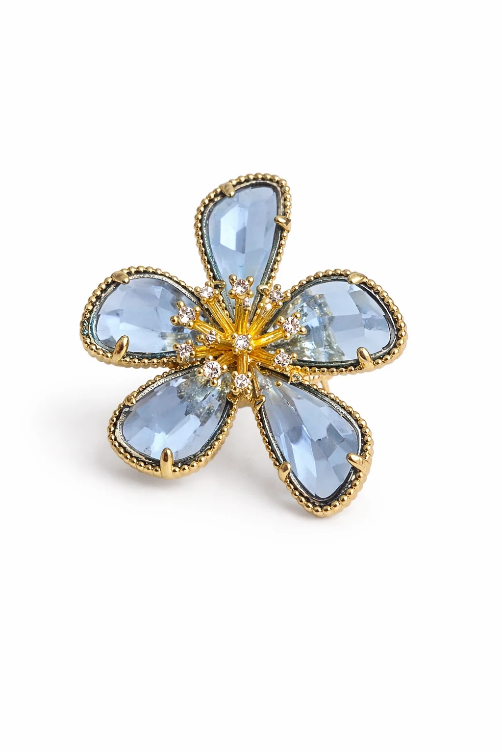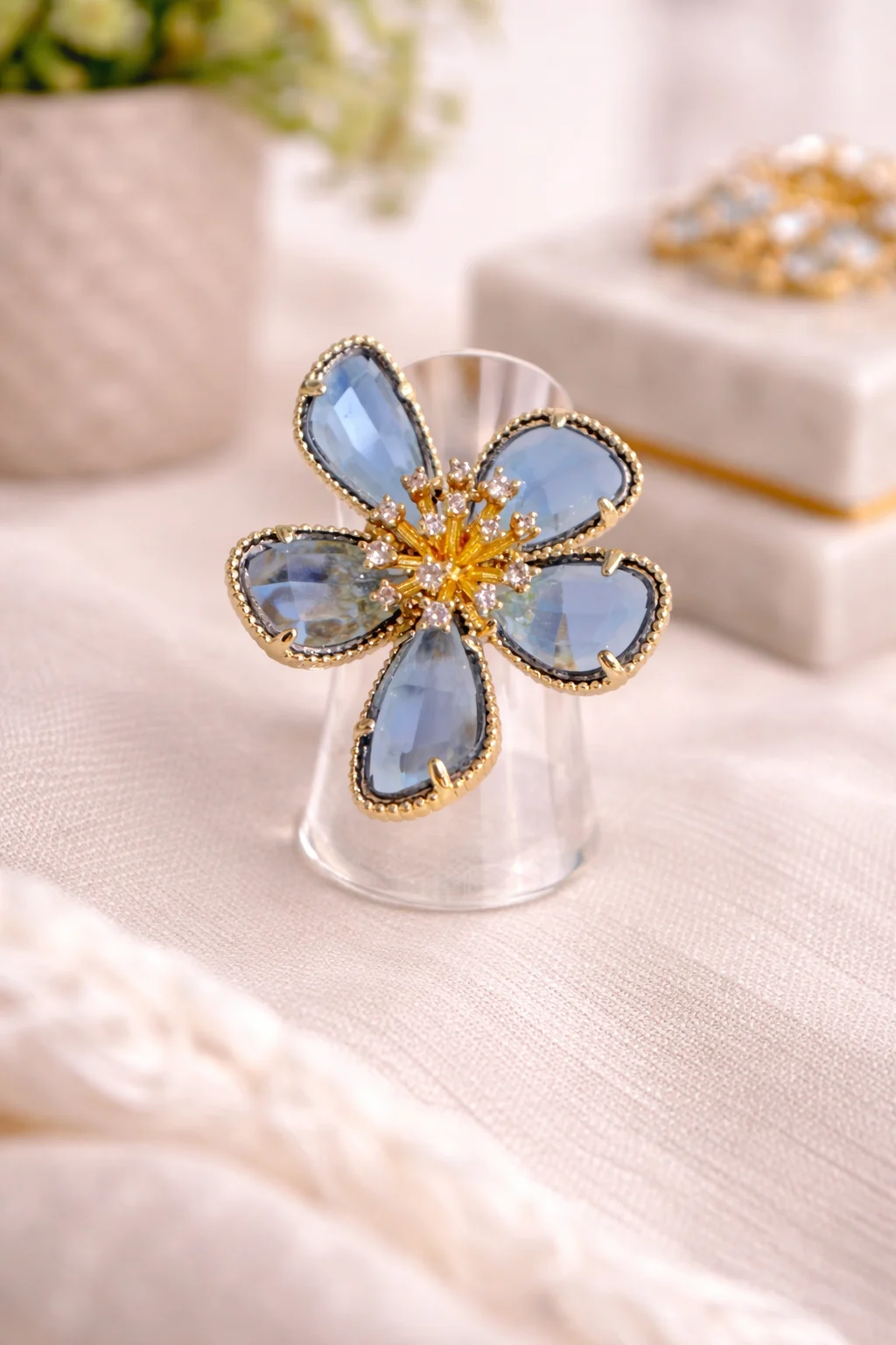 Una flor convertida en joya que combina brillo azul, elegancia y delicadeza en cada detalle.