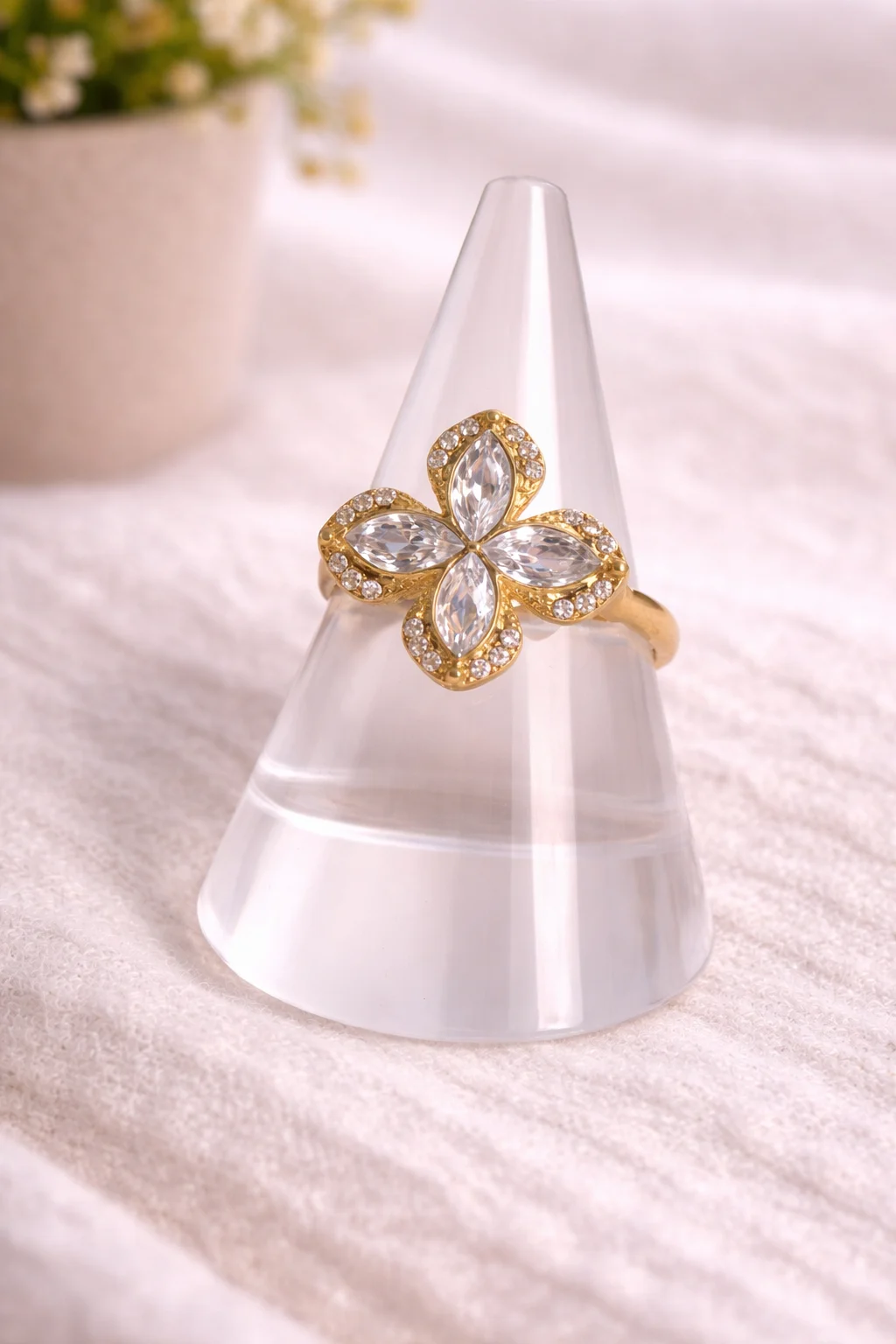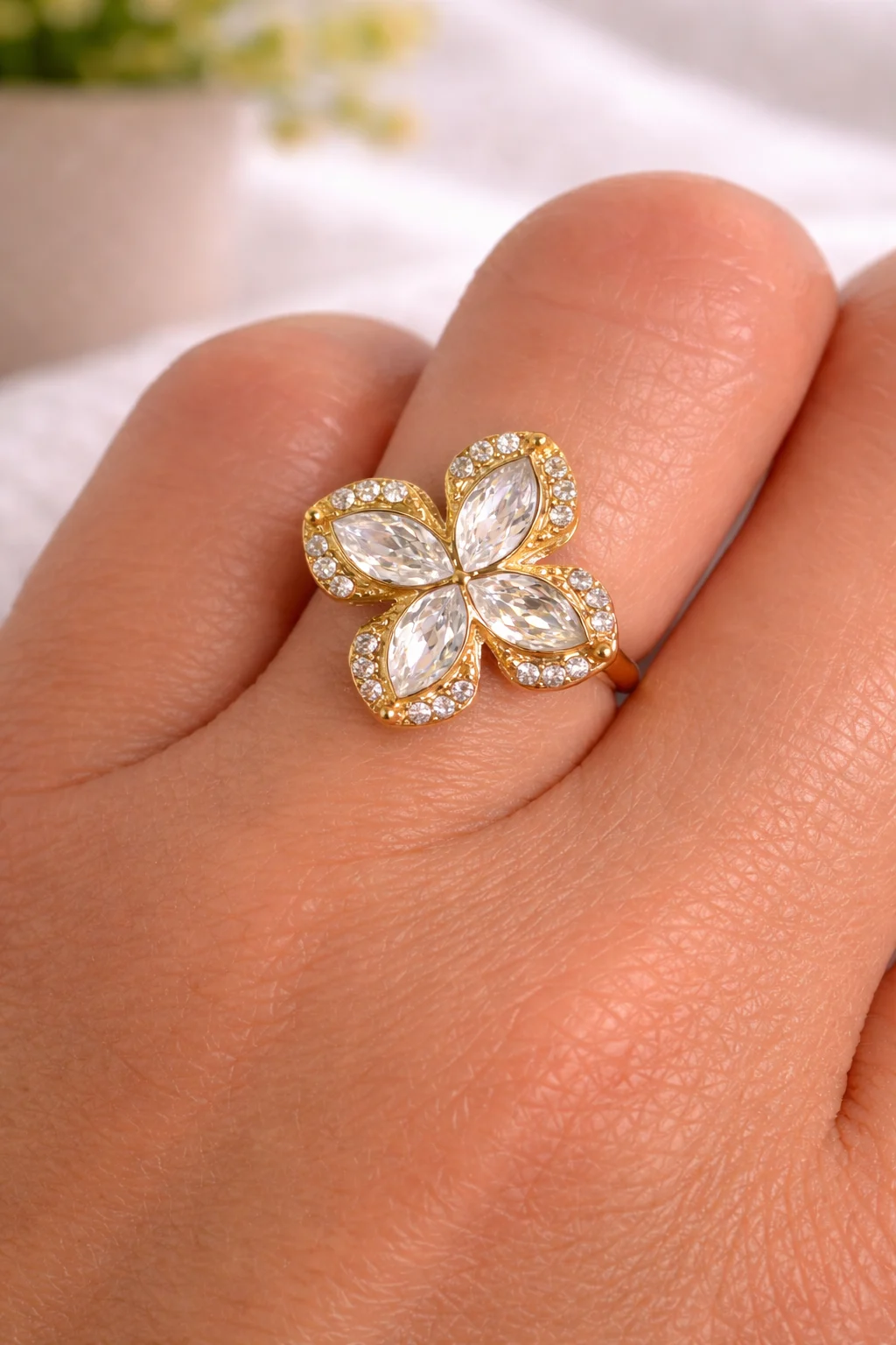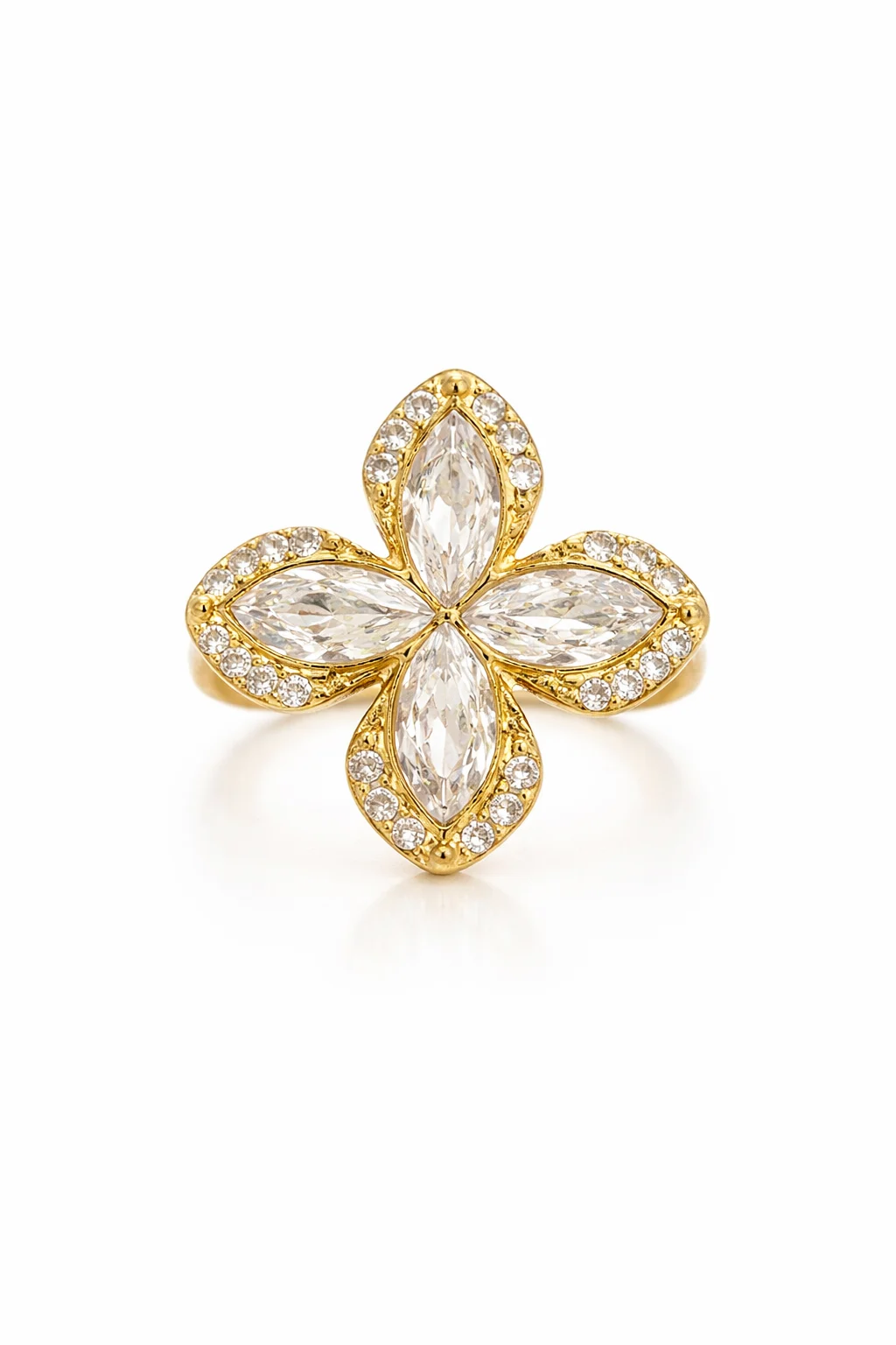 Inspirado en la forma de una flor, este anillo destaca por sus pétalos brillantes con circonitas que reflejan la luz de forma sutil y elegante. Su estructura dorada aporta un toque cálido y refinado, ideal para elevar cualquier look.