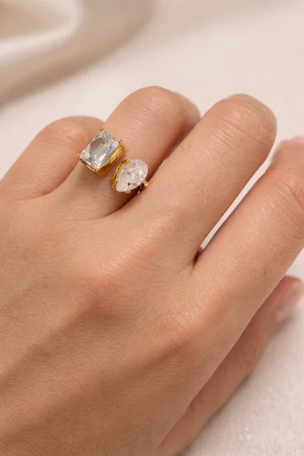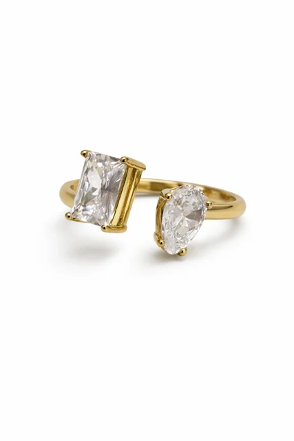 • Diseño: anillo abierto con doble piedra