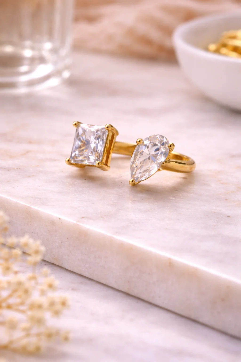 El anillo Dalia es una pieza que destaca por su diseño moderno y elegante. Su estructura abierta sostiene dos circonitas brillantes de formas diferentes que crean un contraste sofisticado y lleno de luz.