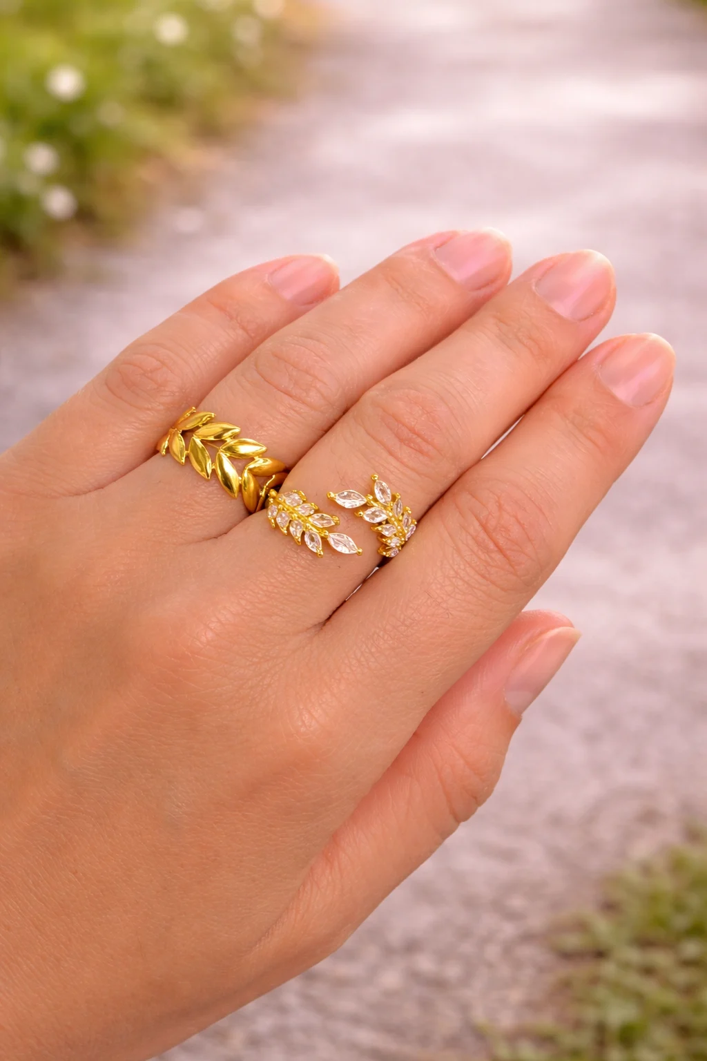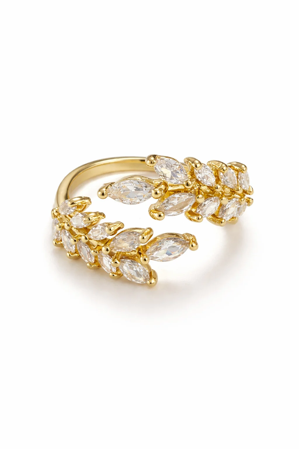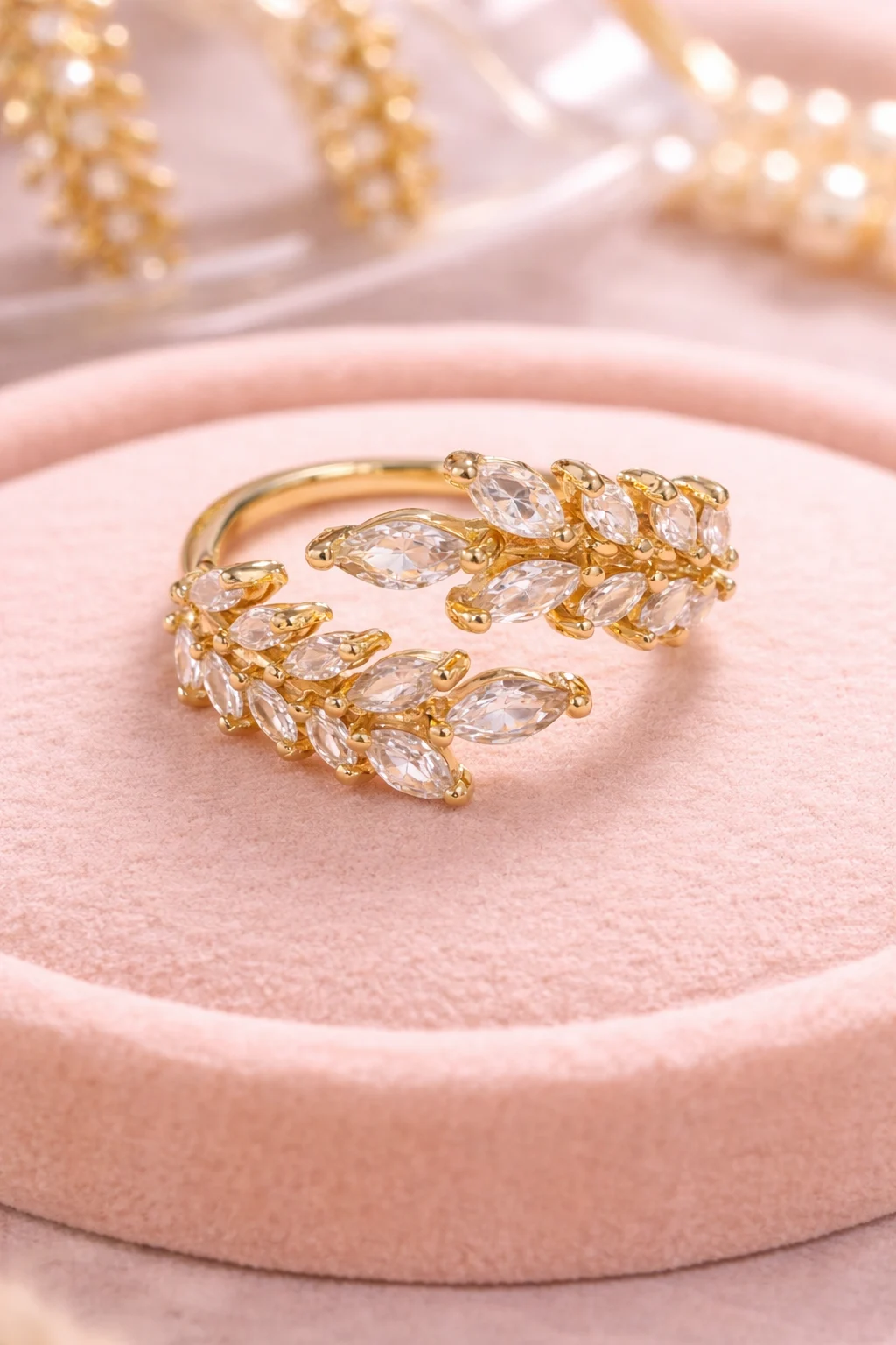 Anillo Eden en acabado dorado con delicadas hojas engastadas con circonitas. Un diseño luminoso, elegante y ajustable que aporta un toque natural y sofisticado a cualquier look.