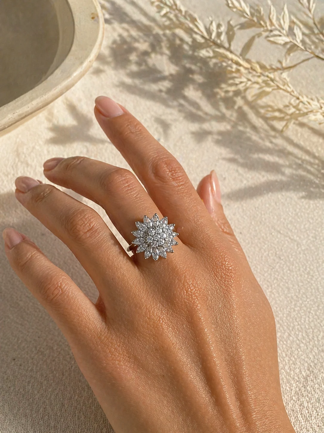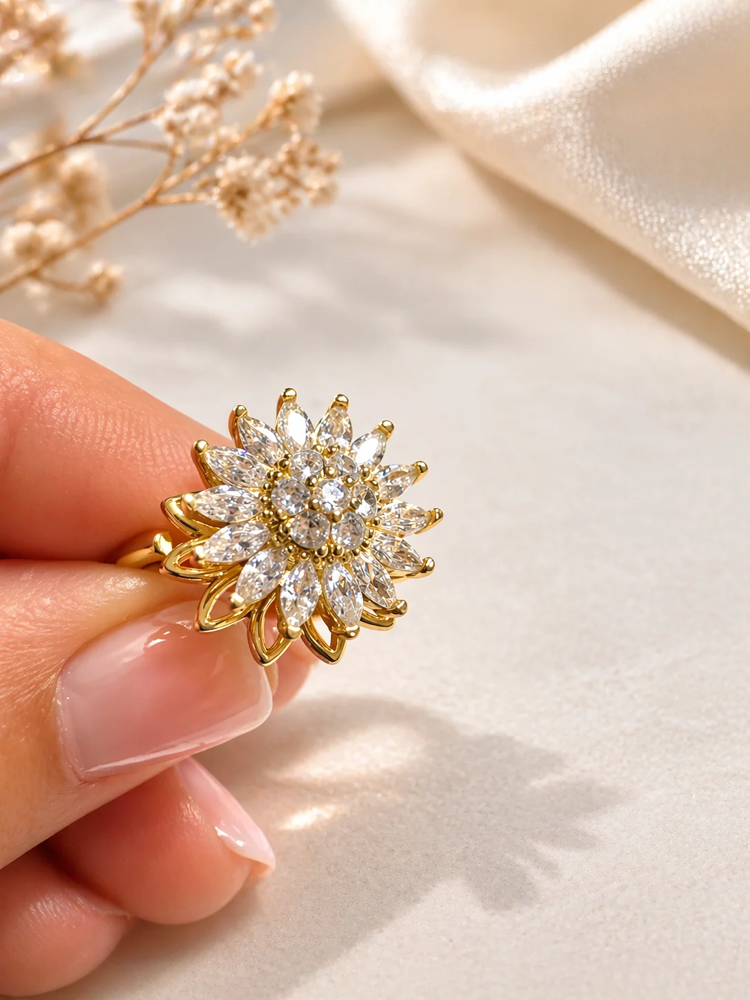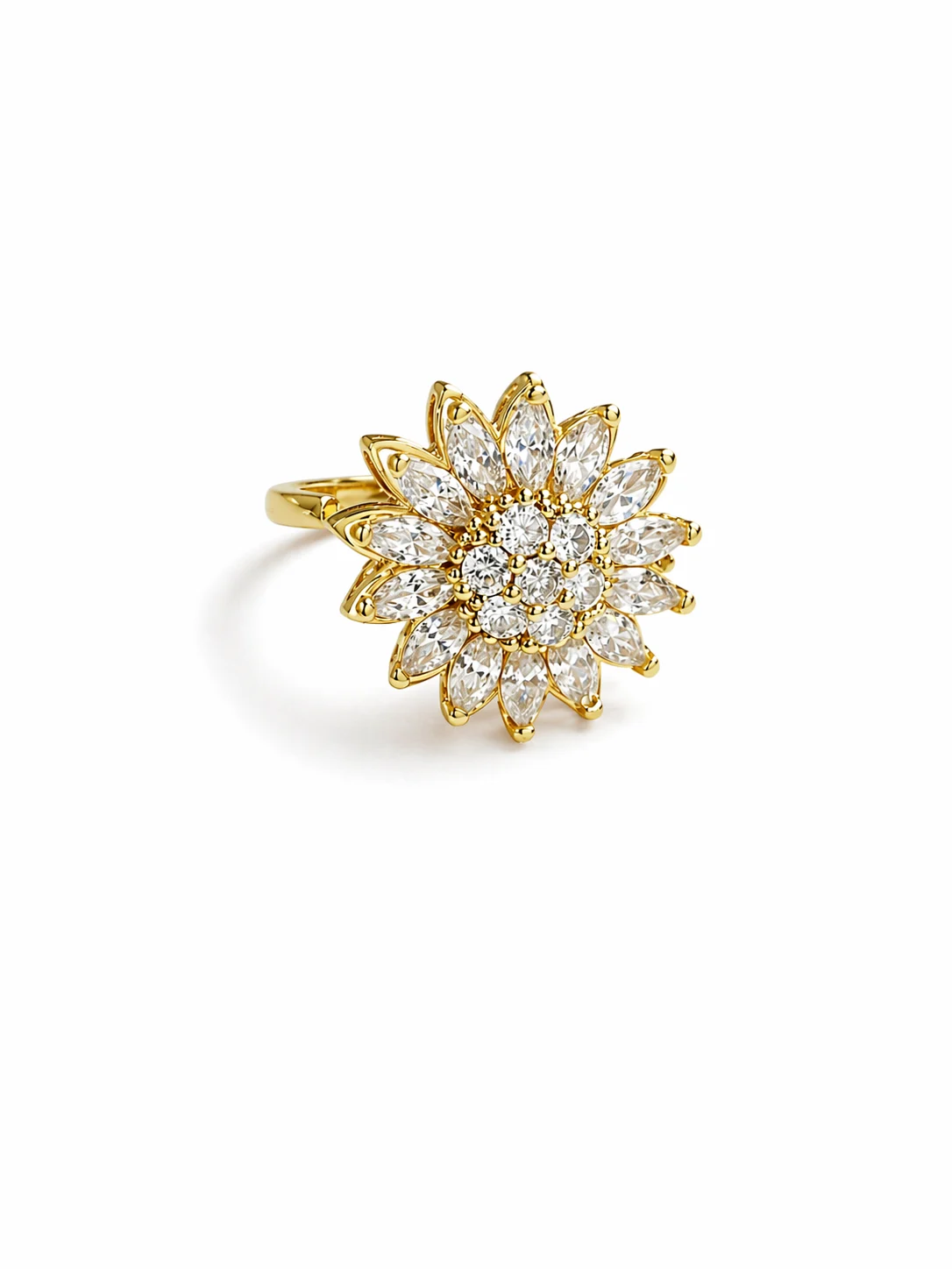 - Anillo ajustable de acero con diseño de girasol y circonitas, disponible en dorado y plateado.