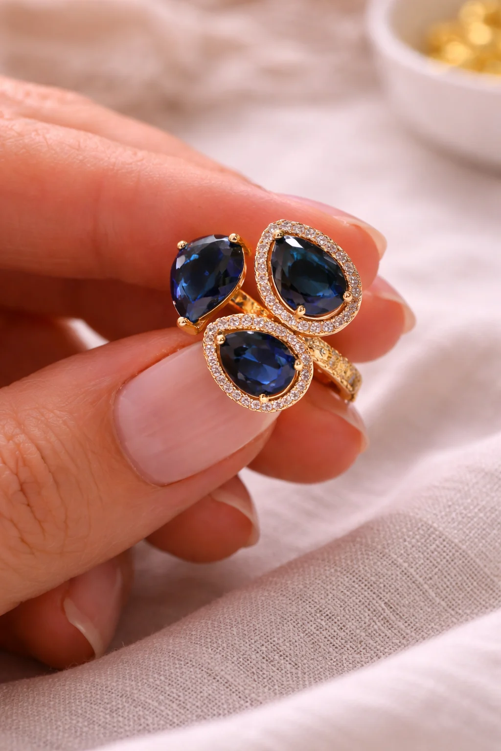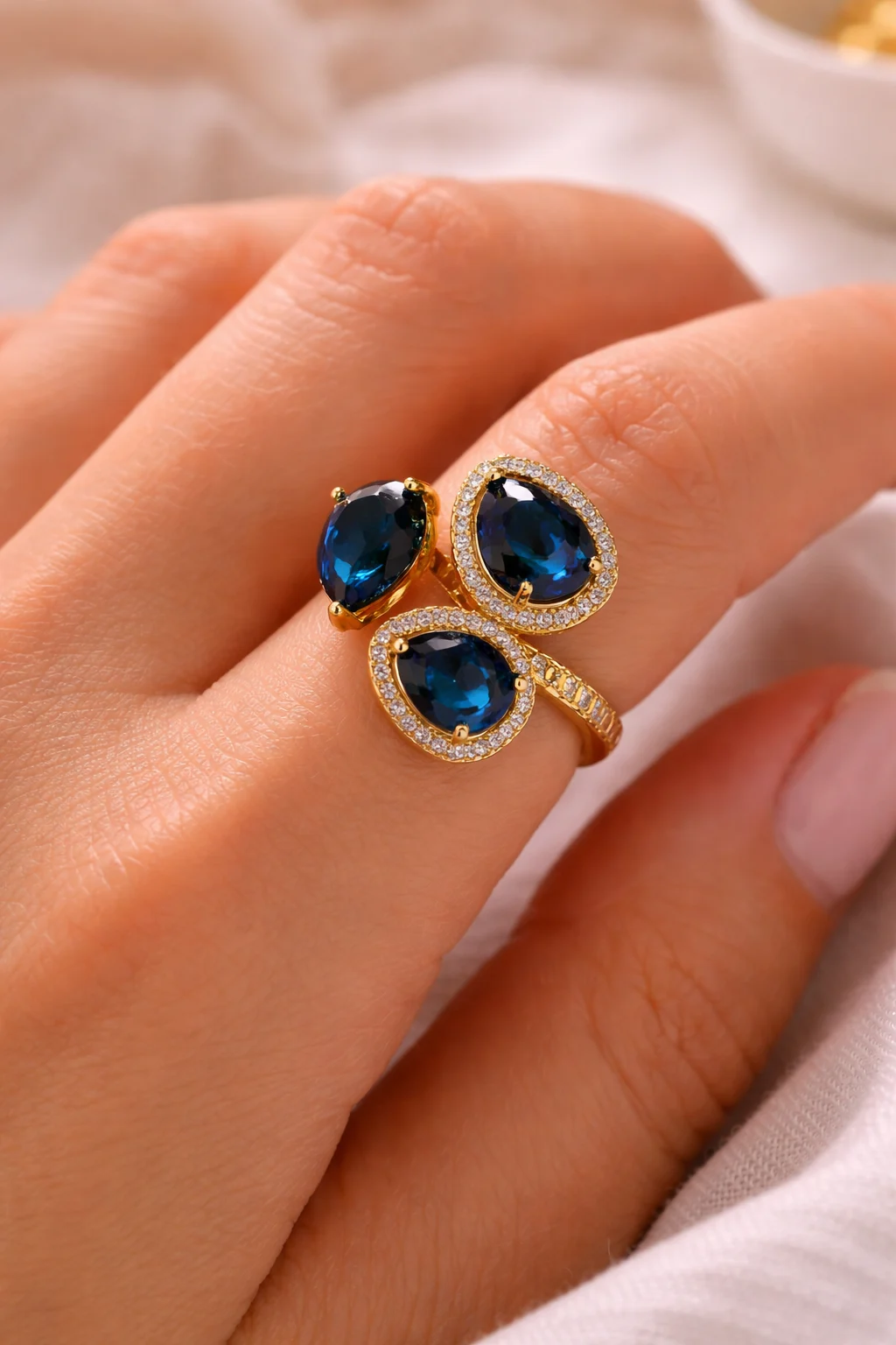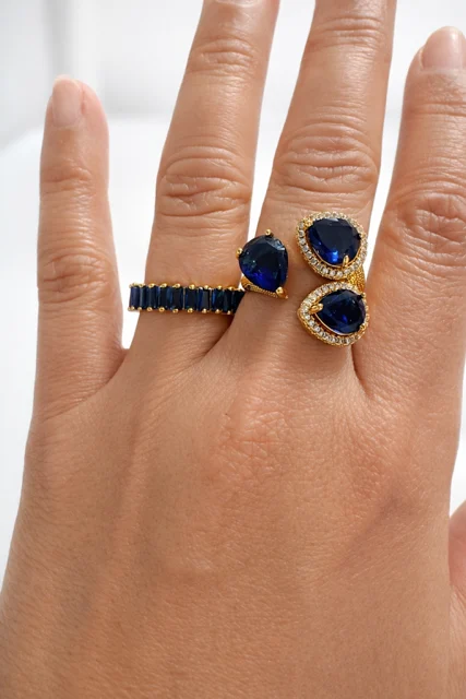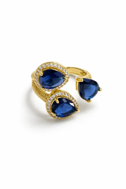 - El Anillo Zafira destaca por su diseño sofisticado con circonitas azules en forma de gota rodeadas de pequeños destellos brillantes.