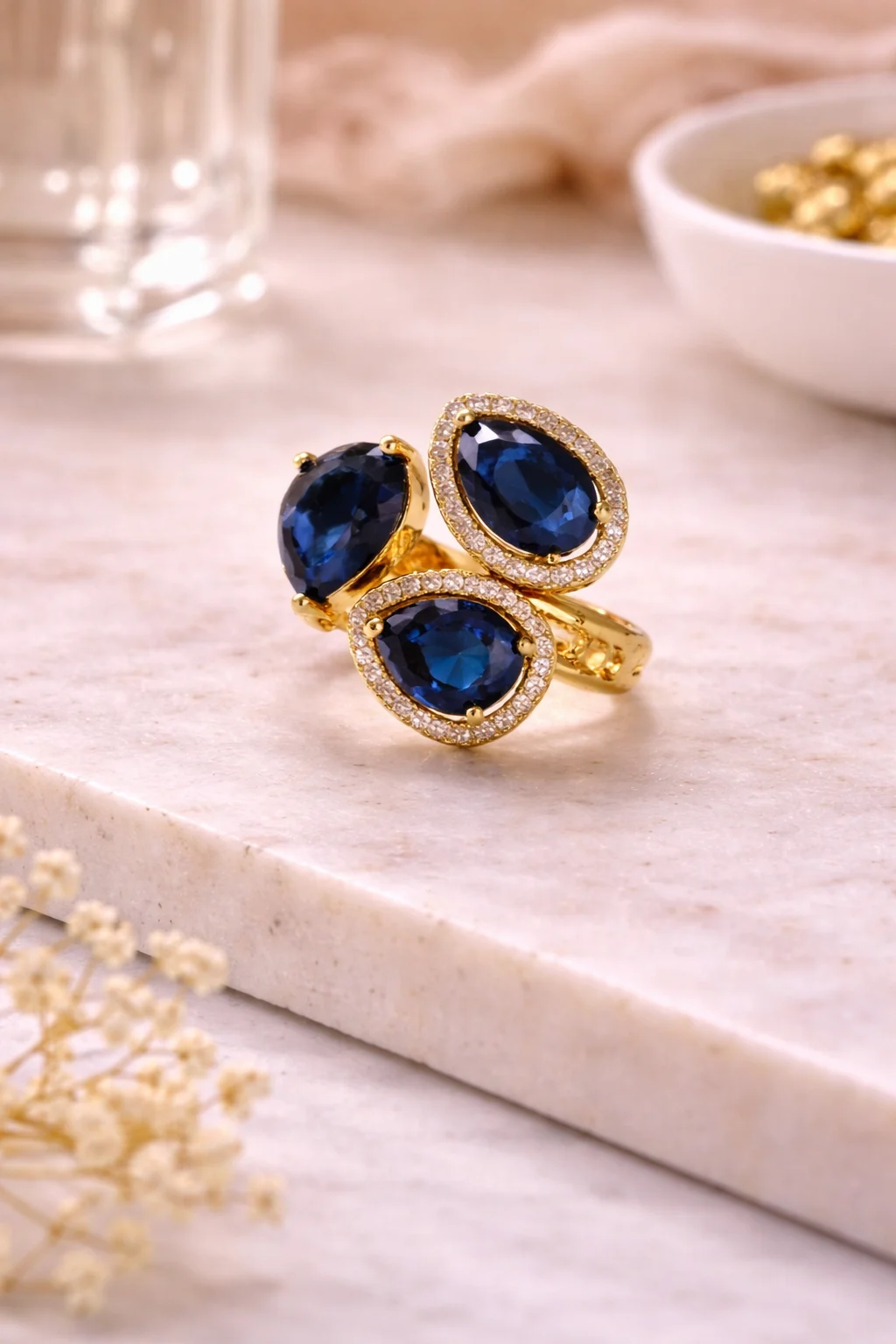 El anillo Zafira es una joya que combina elegancia y carácter. Su diseño presenta circonitas azules en forma de gota que capturan la luz con un brillo intenso, creando un contraste perfecto con el acabado dorado del anillo.