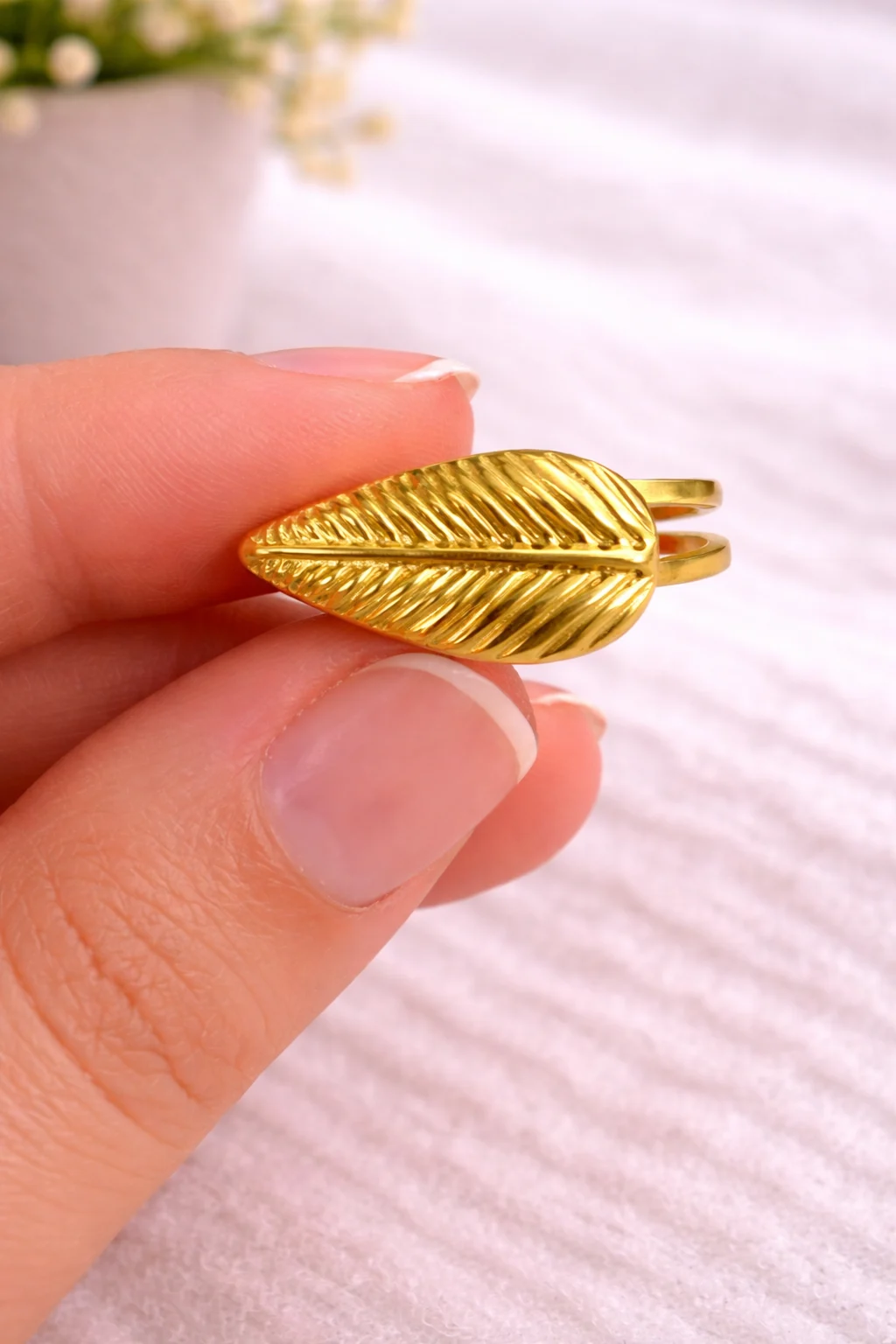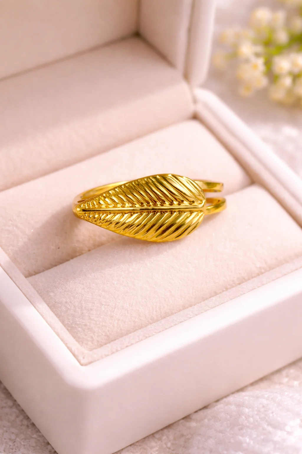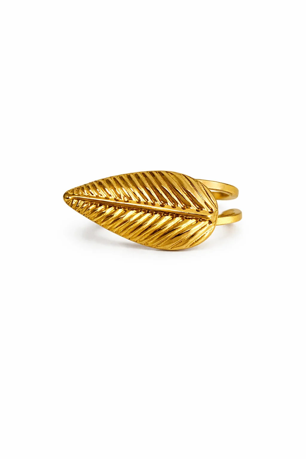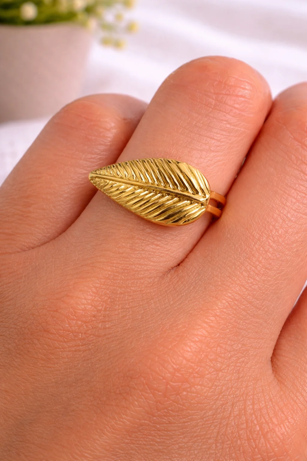 • Anillo Selene con diseño de hoja en acabado dorado.