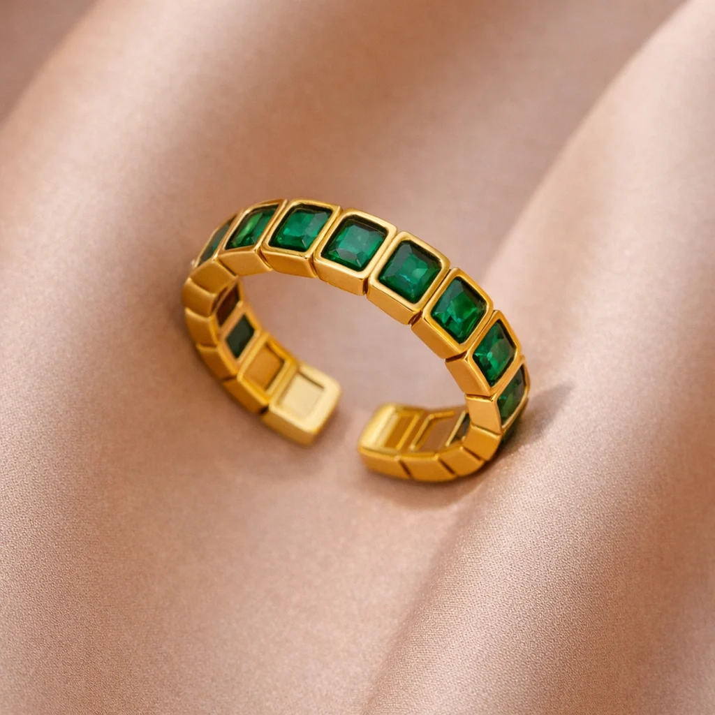 El protagonismo del diseño recae en sus piedras verdes de corte geométrico, que aportan profundidad y un contraste vibrante al acabado dorado del anillo. Este juego de formas y colores crea un efecto visual llamativo y refinado que realza la mano con un toque moderno.