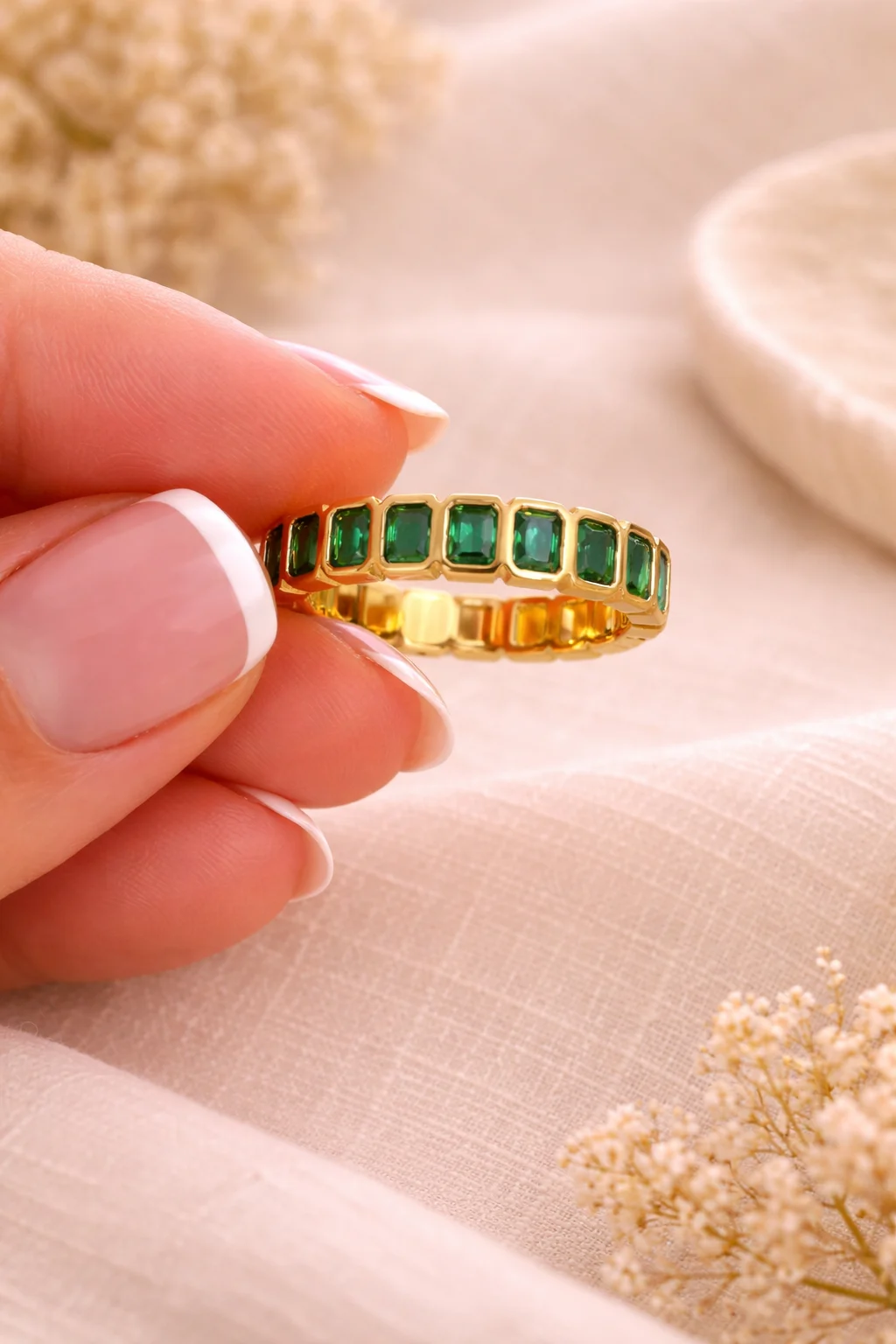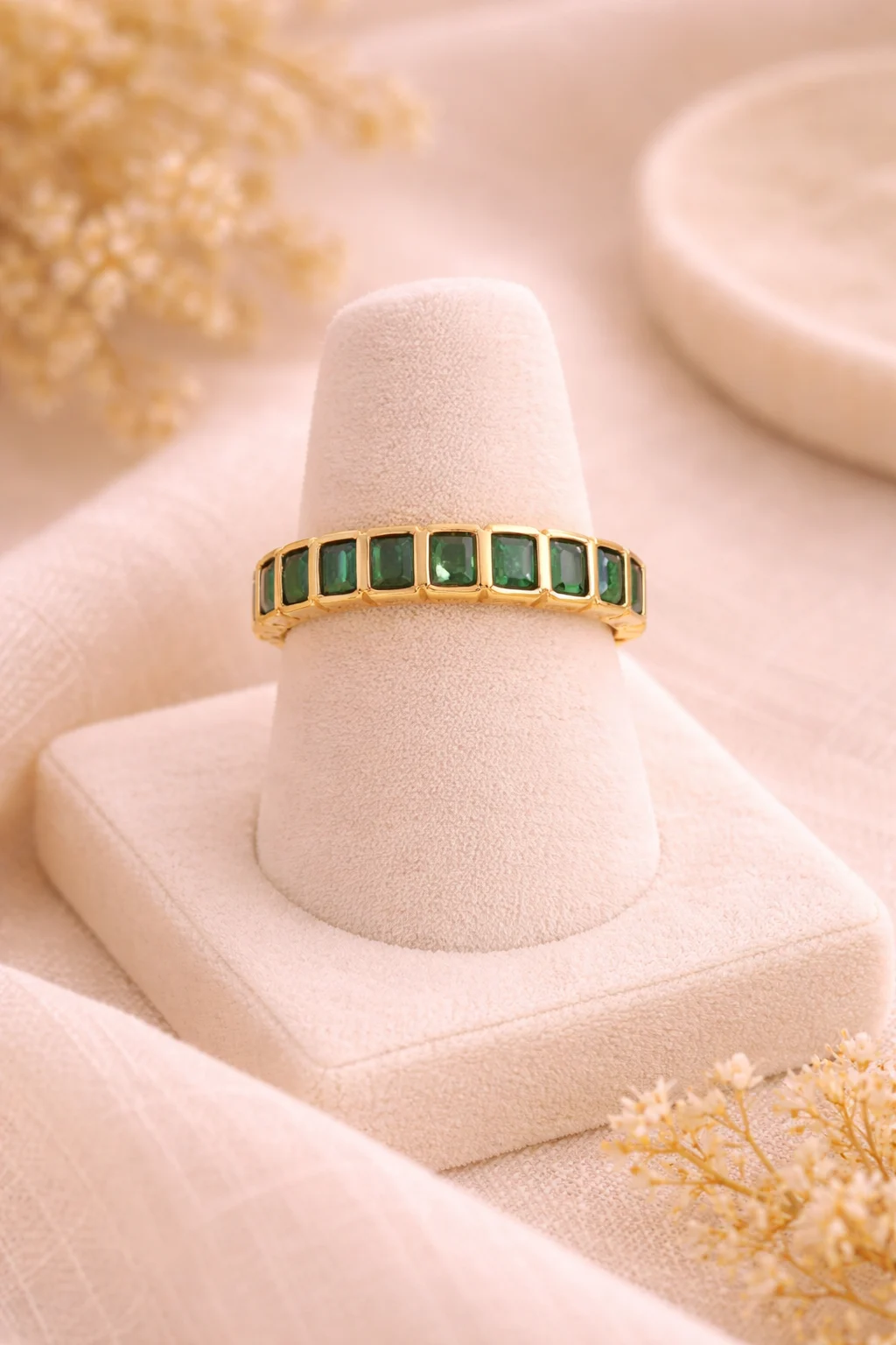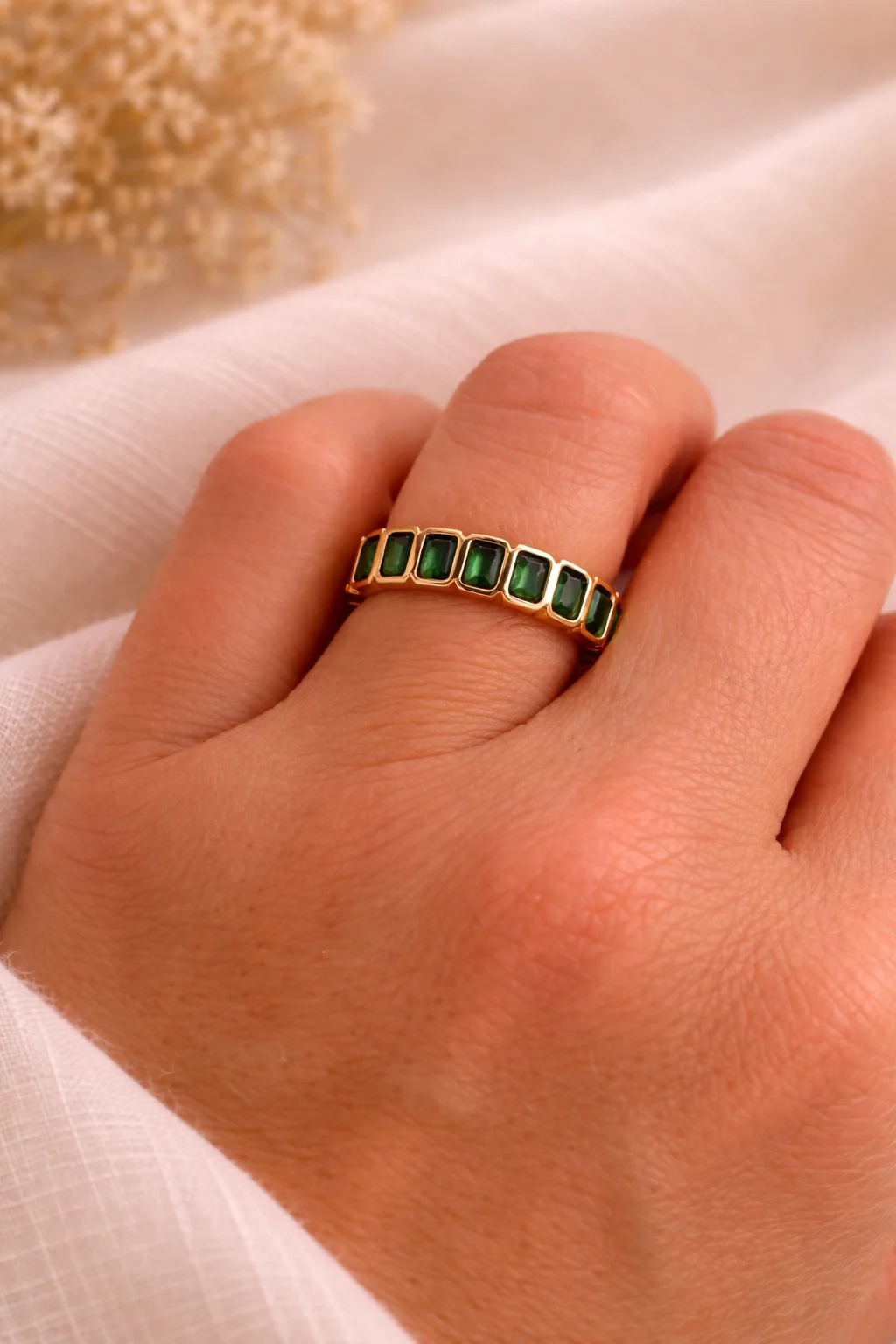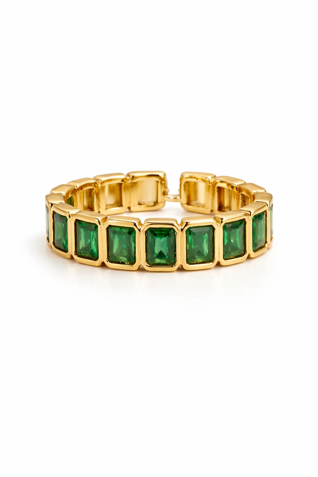 Anillo dorado con piedras verdes rectangulares que aporta un toque elegante, moderno y sofisticado a cualquier estilo.