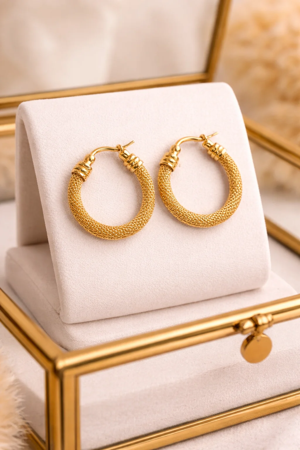 - Aros de diseño trenzado con acabado dorado y textura de cadena.