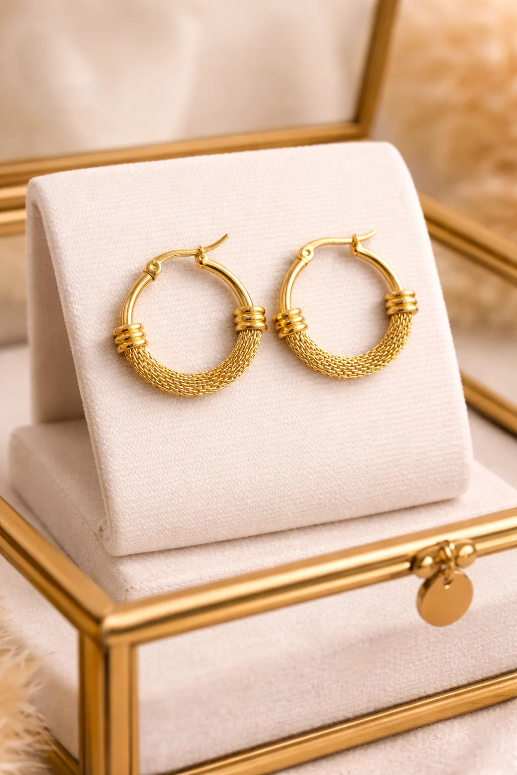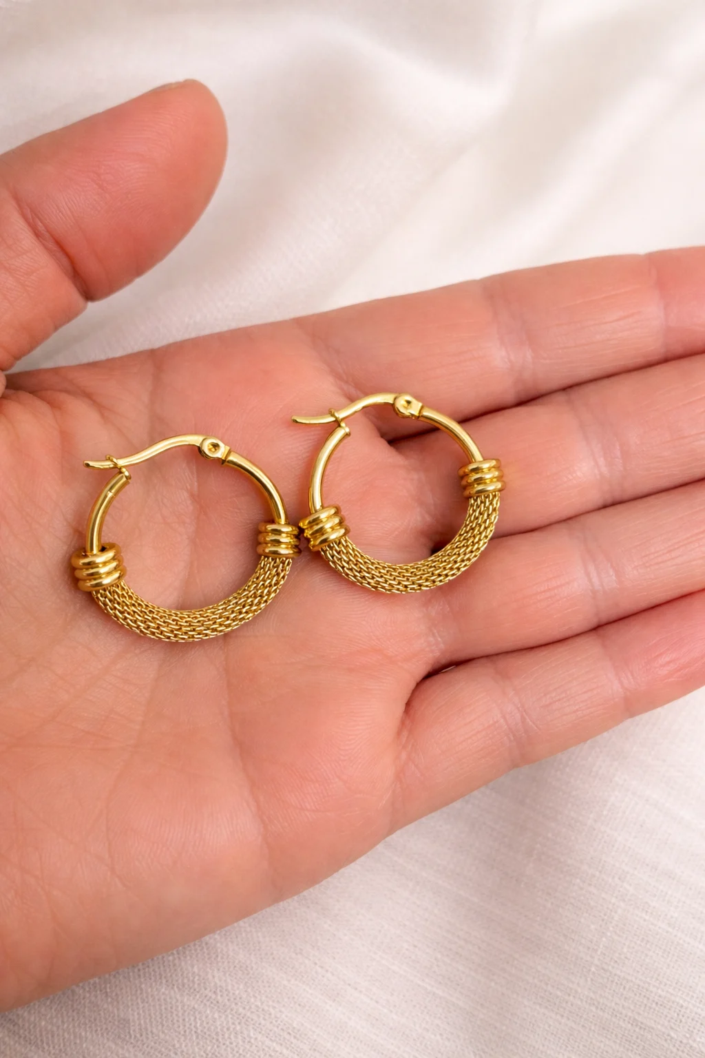 Aros Linked en acero inoxidable dorado con textura trenzada que aporta elegancia y personalidad a cualquier look.