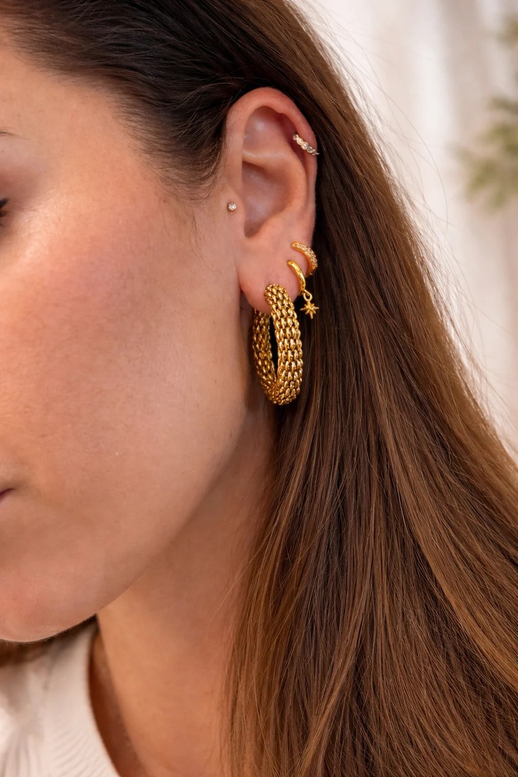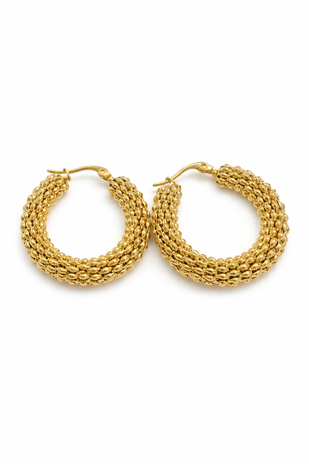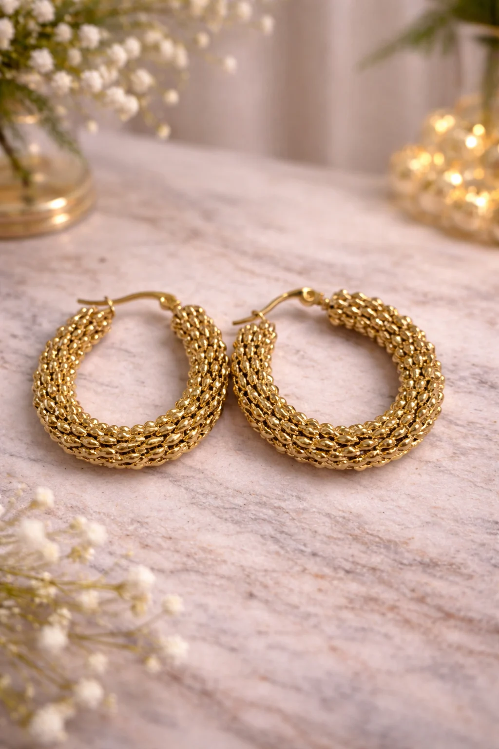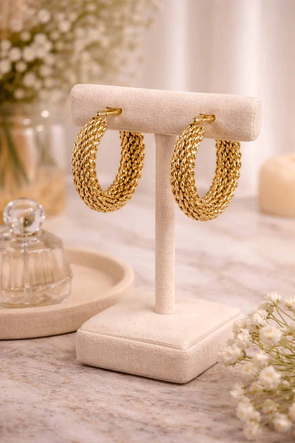 Los Aros Nexus Dorados destacan por su diseño trenzado, lleno de carácter, y por su propuesta elegante, que combina volumen, textura y sofisticación en una sola pieza. Su estructura entrelazada crea un efecto visual dinámico que aporta profundidad y estilo, convirtiéndolos en un complemento perfecto para realzar cualquier look.