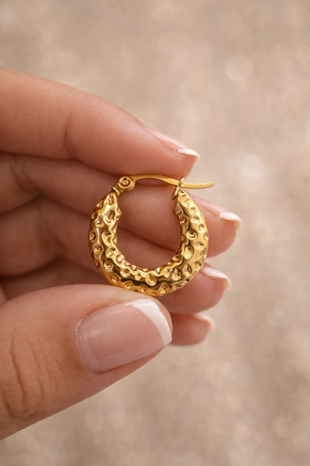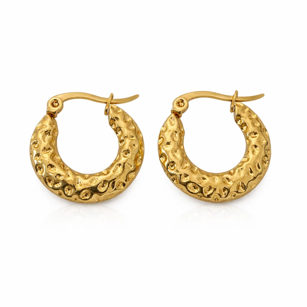 Aros dorados de acero inoxidable con textura elegante. Un básico sofisticado, cómodo y versátil para cualquier ocasión.