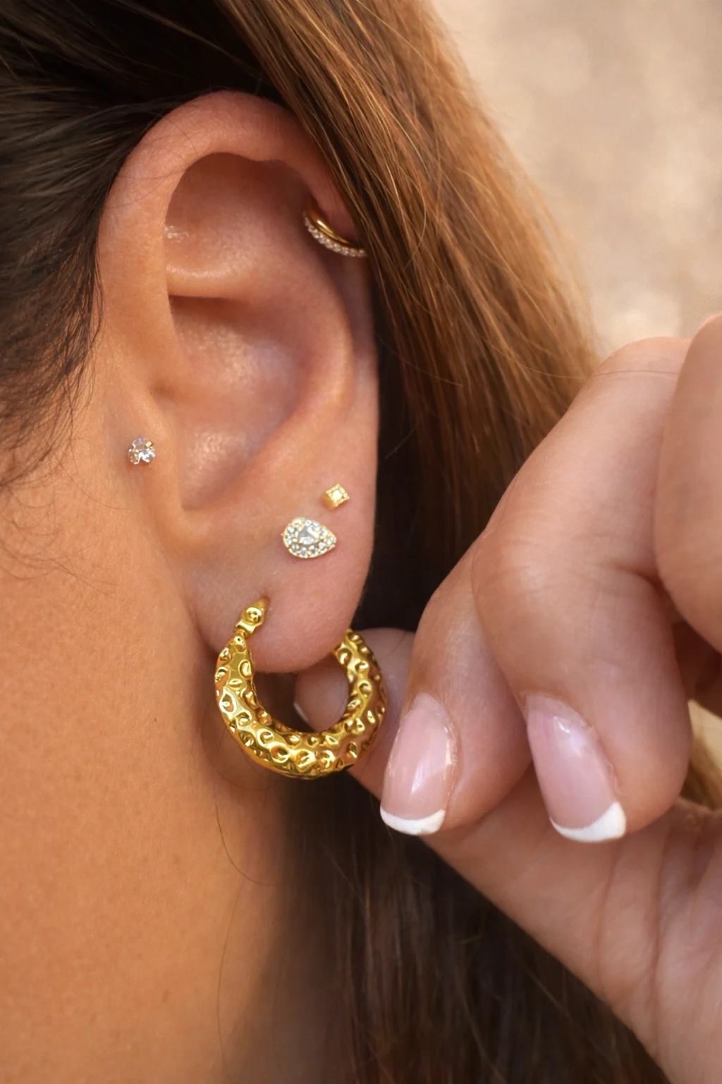 Los Aros Terra destacan por su diseño orgánico y su textura irregular, inspirada en las formas naturales. Su acabado dorado con relieve crea un juego de luces único que aporta carácter y elegancia a cualquier look.