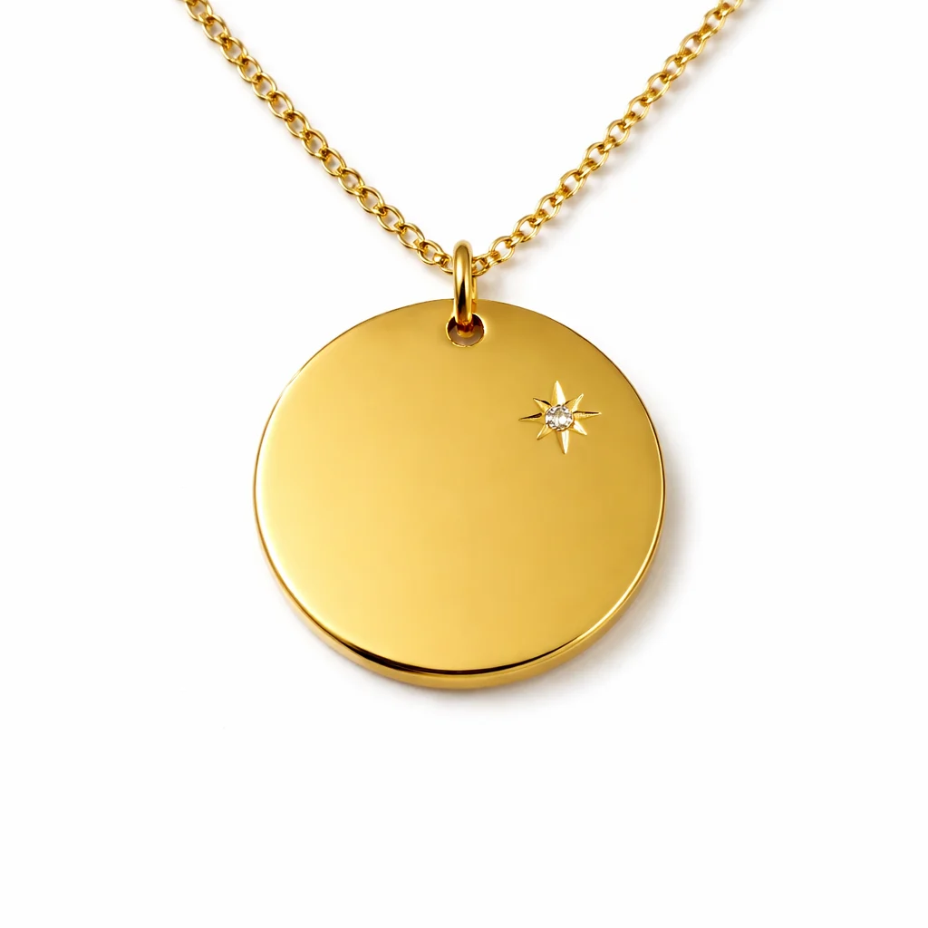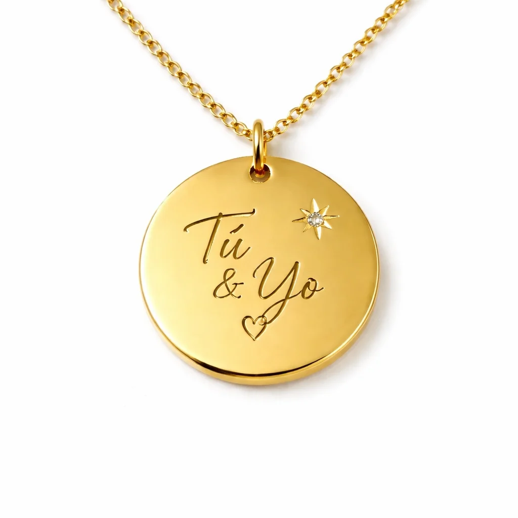Etiquetas: chapa con nombre grabado, chapa personalizada con foto o texto, colgante personalizado acero, Collar dorado minimalista con brillo en acero inoxidable