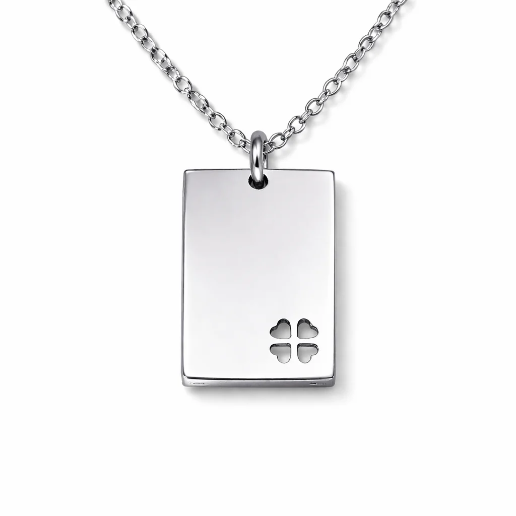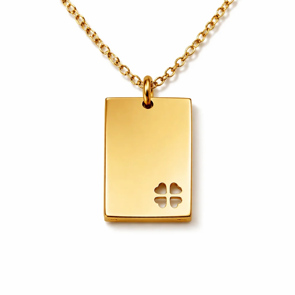 El collar Chapa Trébol combina elegancia y significado en una pieza única. Su diseño en forma de chapa rectangular incorpora un delicado trébol, símbolo de suerte, protección y buenos deseos.