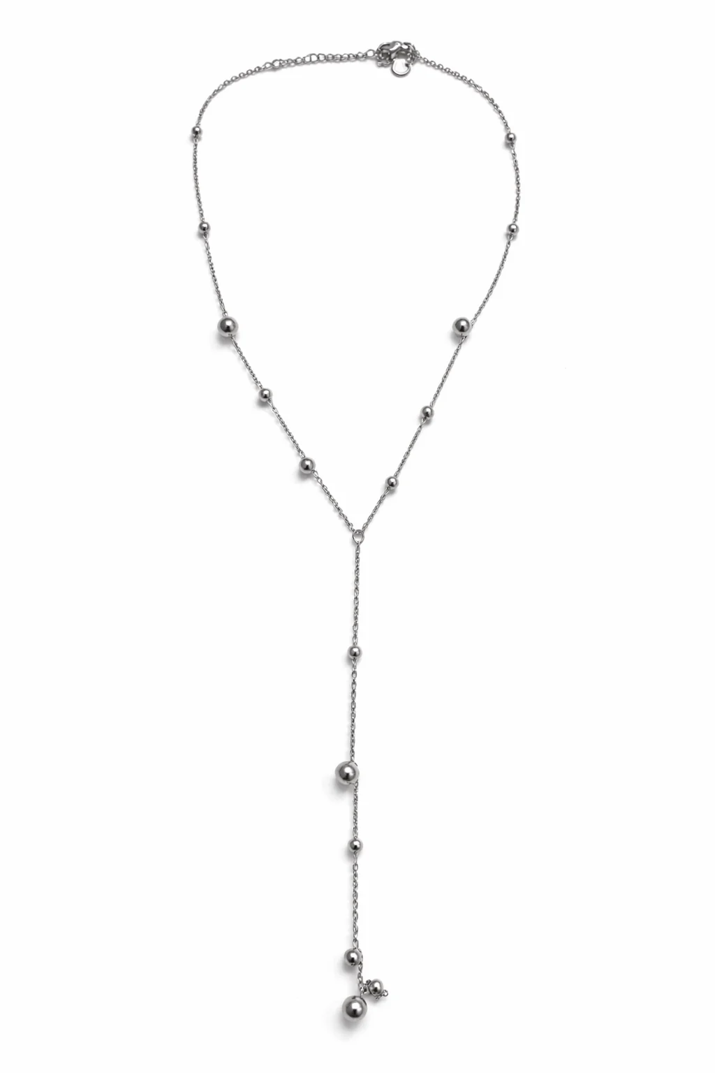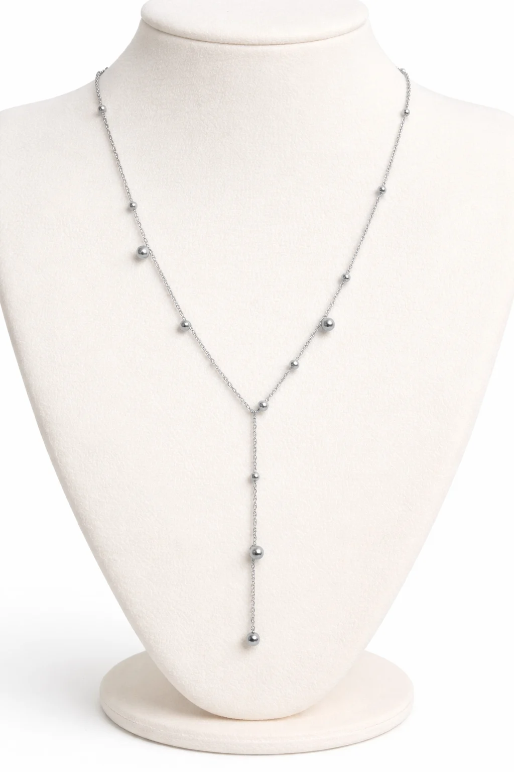 Collar Aurora con diseño fino y caída en Y, decorado con pequeñas esferas. Disponible en dorado y plateado, es una pieza elegante y versátil para cualquier ocasión.