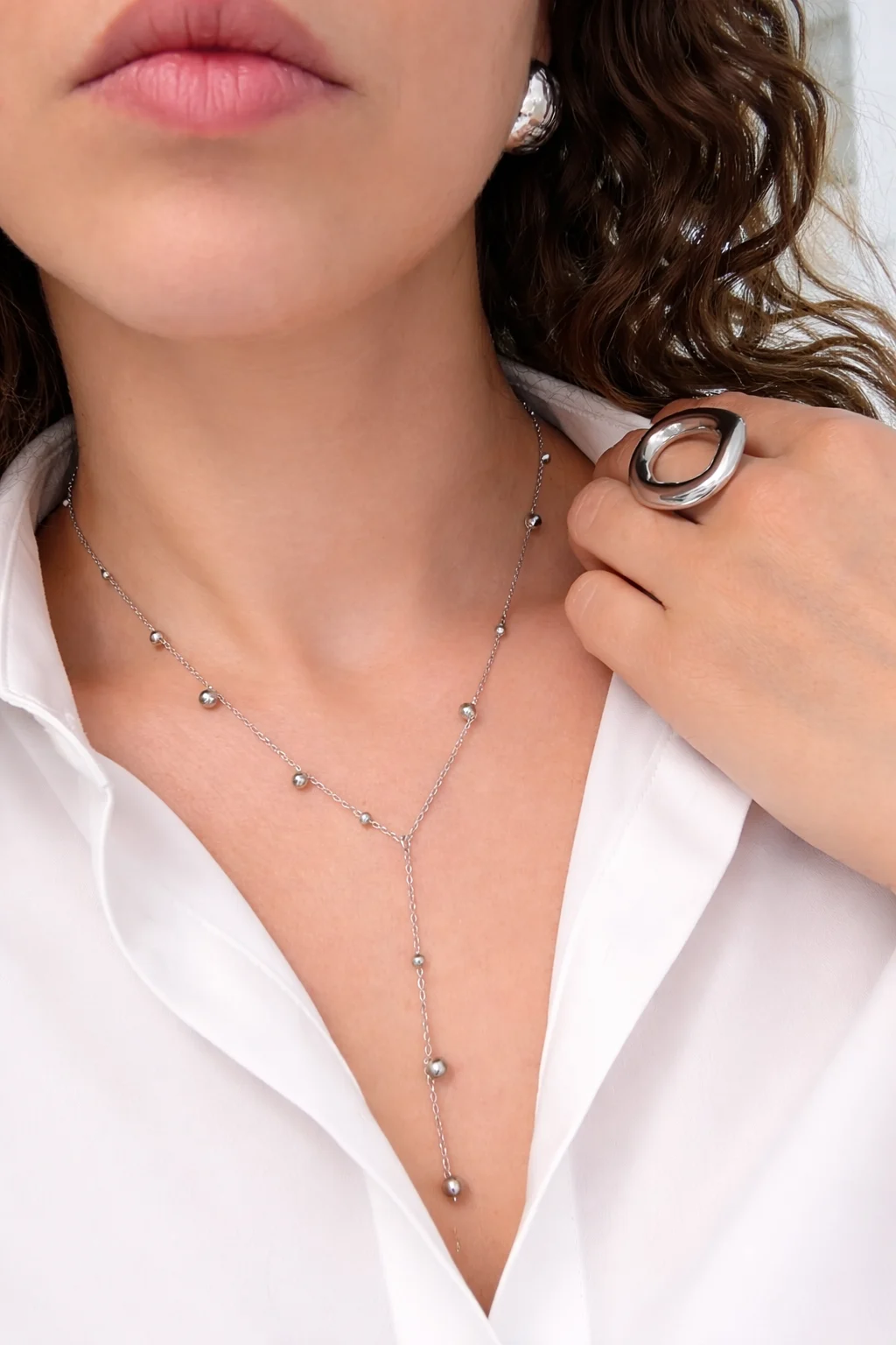 Las pequeñas esferas distribuidas a lo largo de la cadena aportan un toque de brillo delicado que capta la luz con suavidad, creando un movimiento elegante y refinado. Este detalle convierte el collar en una pieza versátil que aporta personalidad sin perder la simplicidad característica del diseño.