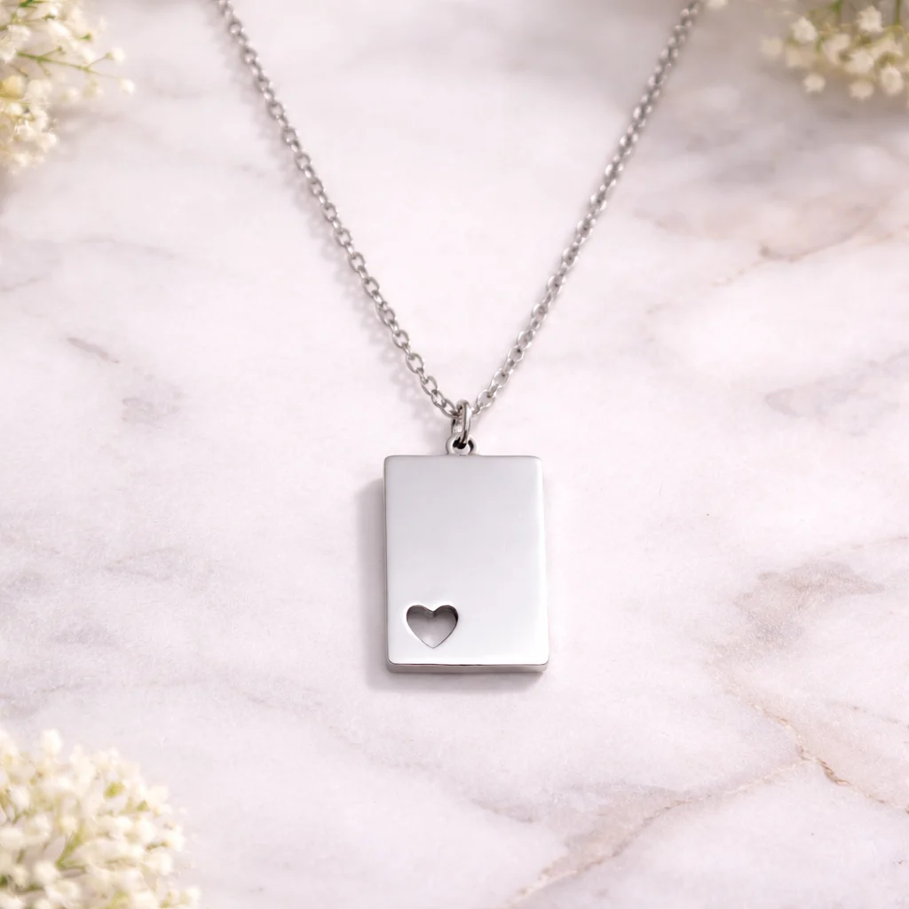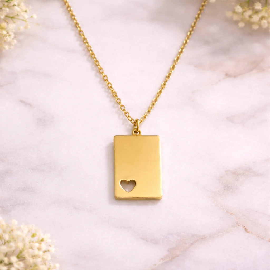 Su diseño rectangular incorpora un sutil corazón calado, símbolo de cariño, conexión y recuerdos especiales. Gracias a su superficie lisa, puedes personalizarlo con un nombre, una inicial o una palabra significativa, creando una joya única y personal.