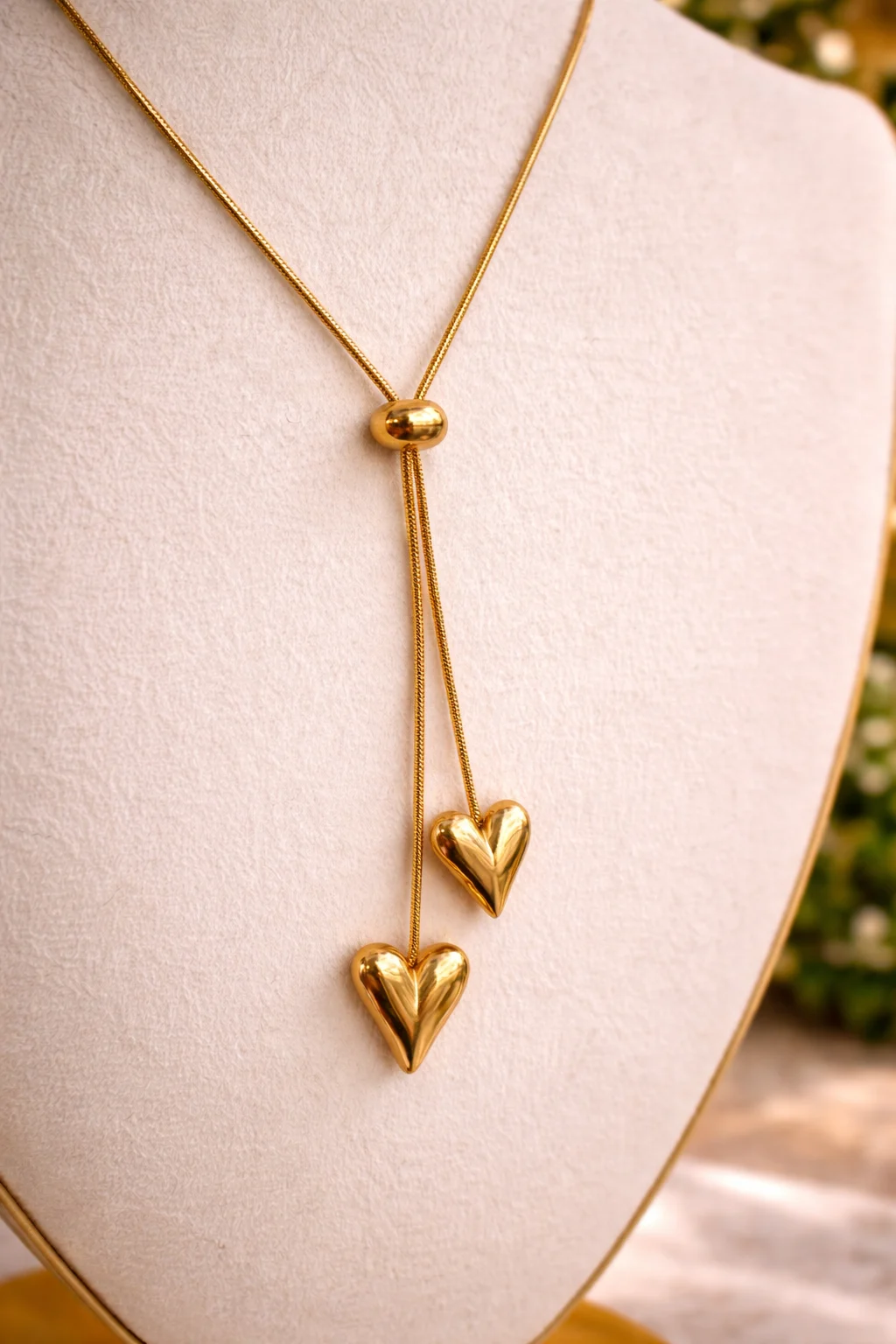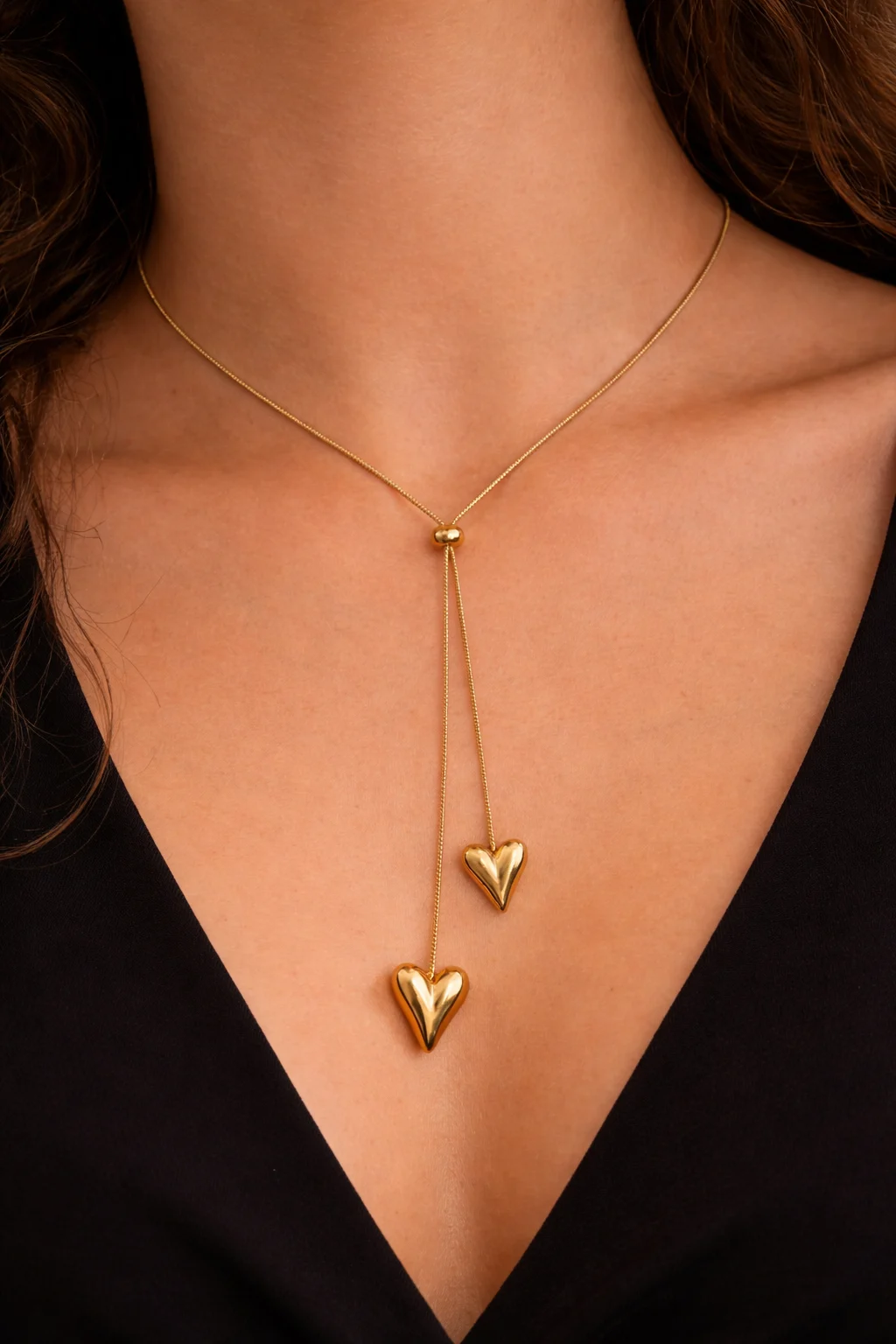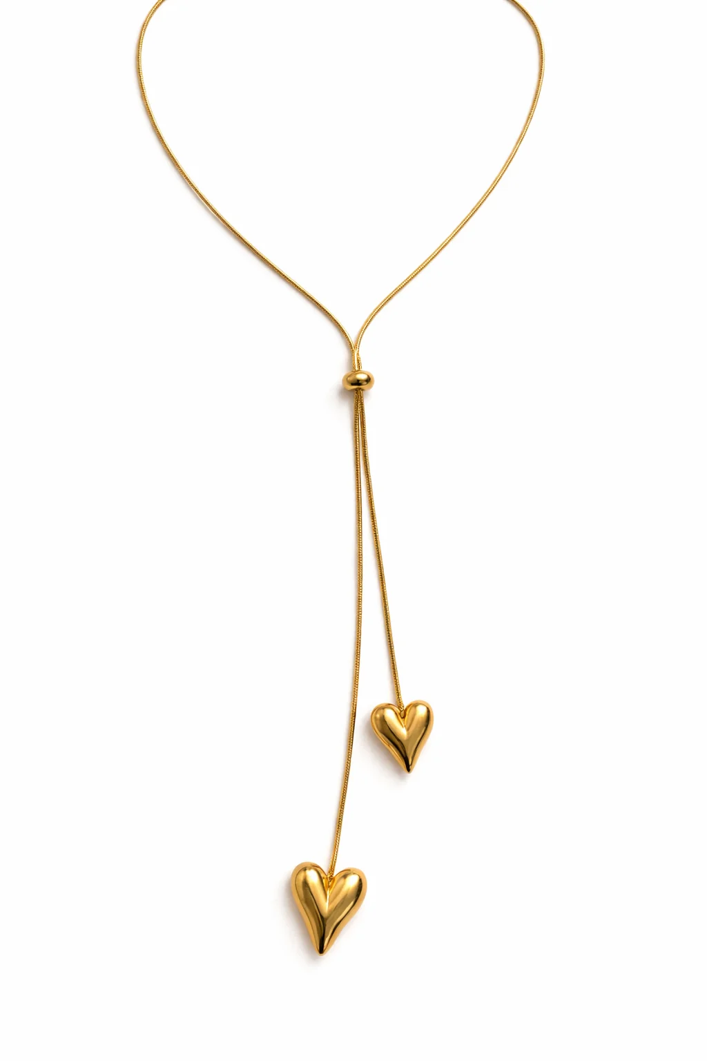 - Collar doble corazón en acero inoxidable dorado con diseño en caída y bolita central ajustable.
