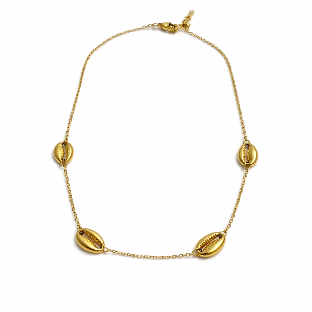 - El collar Nerea combina la delicadeza de su cadena fina con el encanto natural de sus conchas doradas.
