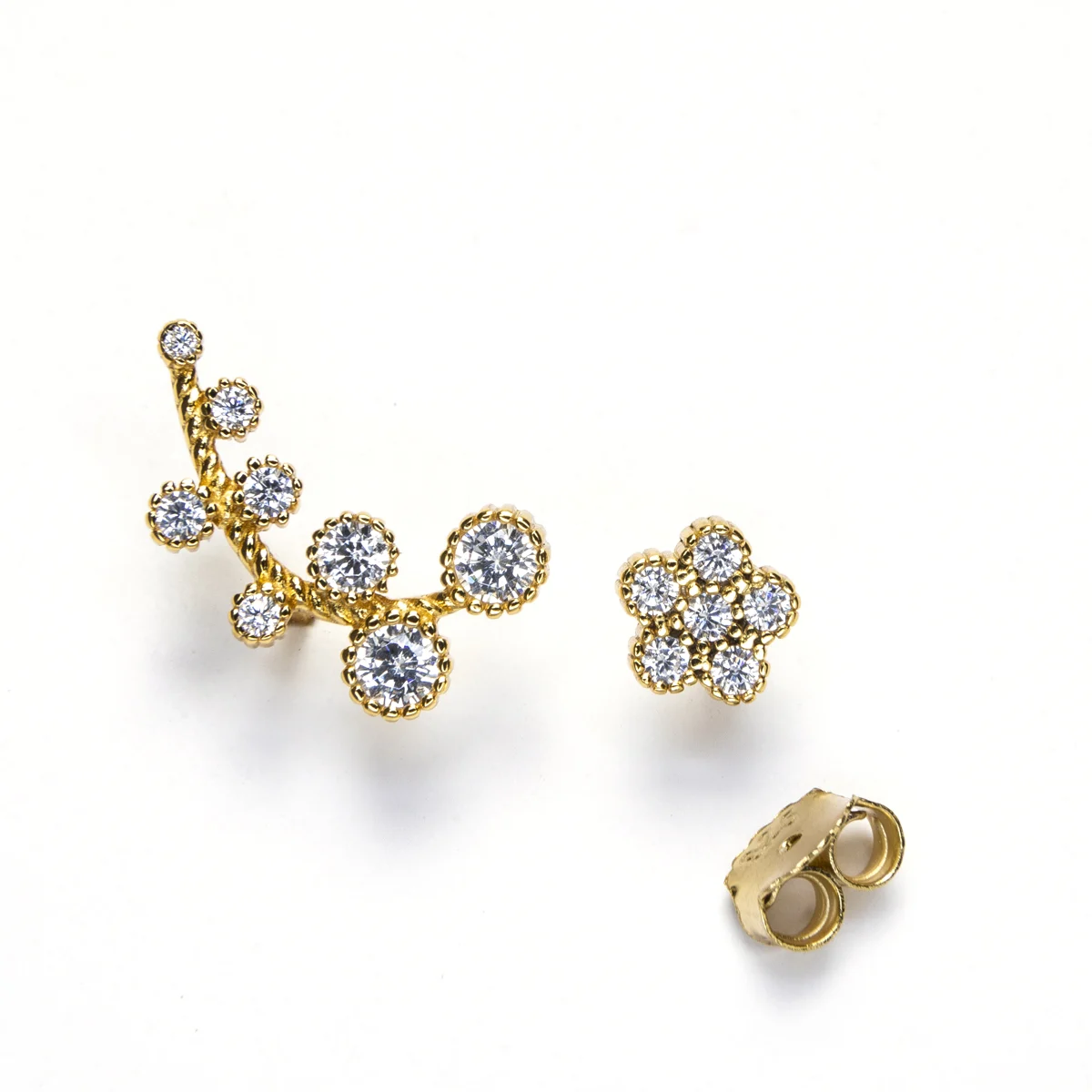 - Pendientes Dúo Bloom Oro en plata de ley 925 con acabado dorado, con diseño asimétrico de flor y rama con circonitas.
