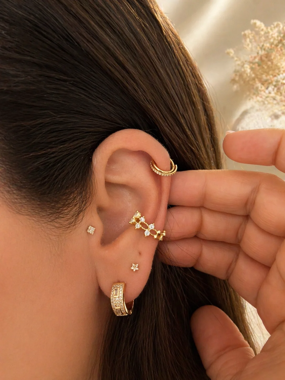 Su estructura ligeramente más ancha aporta presencia en la oreja, convirtiéndolo en una pieza protagonista sin perder elegancia. El contraste entre las piedras redondas y las baguette aporta un acabado más “joyería fina”, ideal para quienes buscan un accesorio con carácter y estilo.