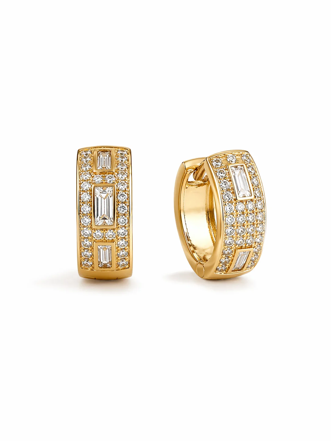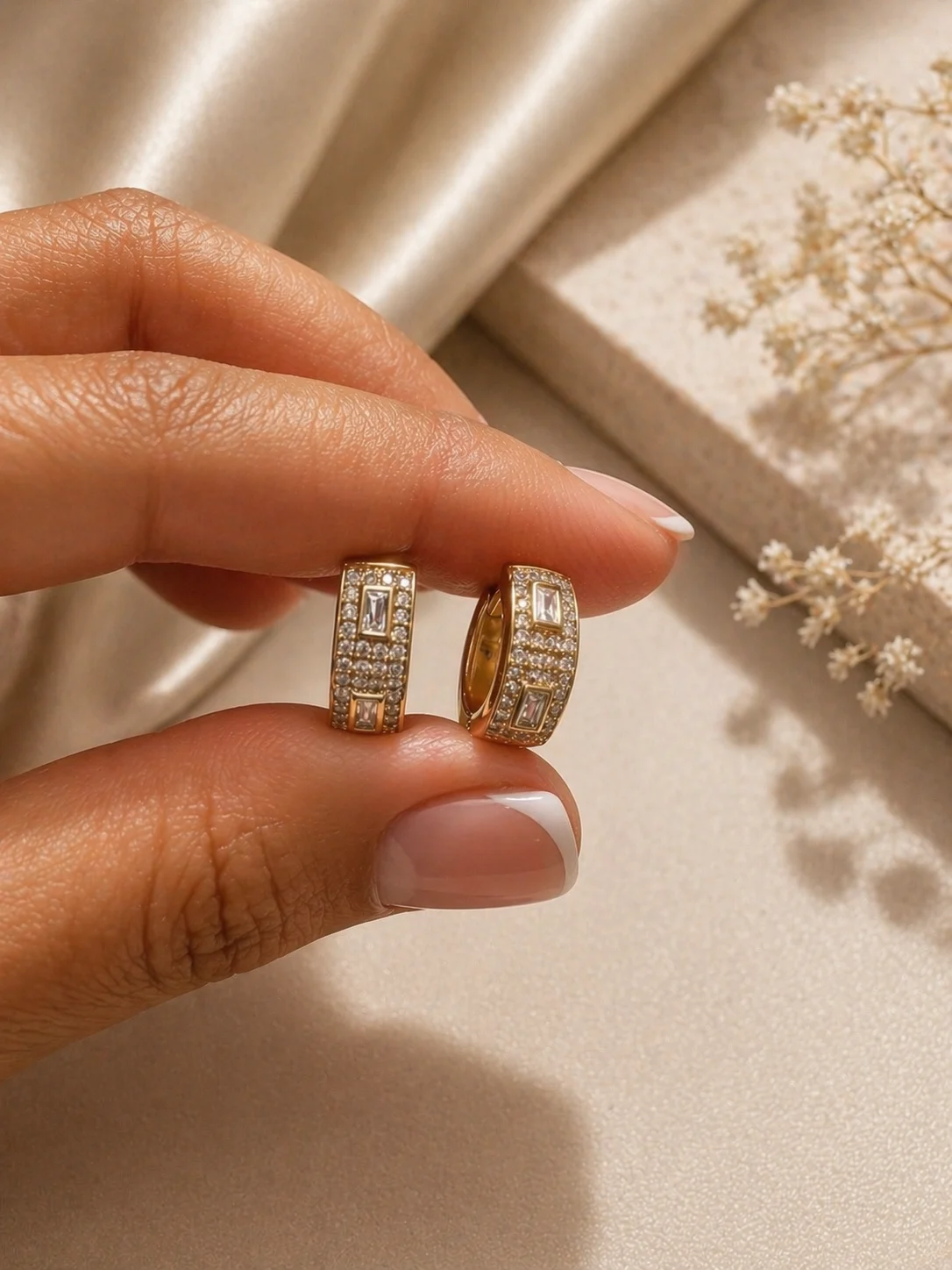 - Aros tipo huggie con pavé de circonitas y detalles baguette en acero inoxidable.