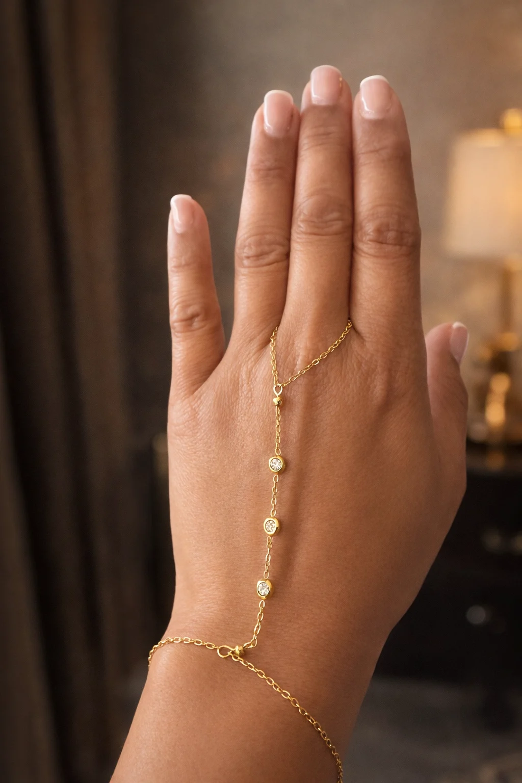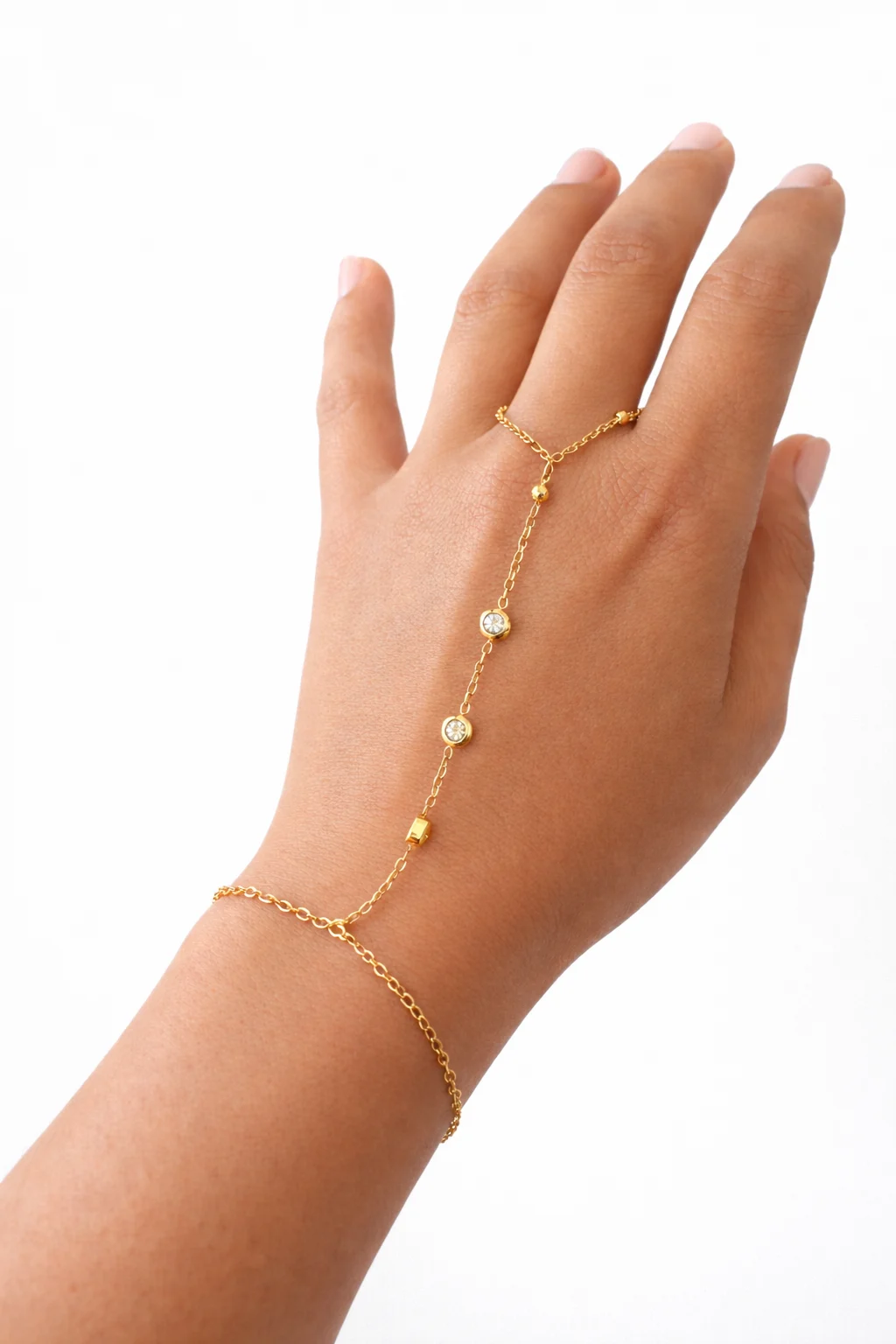 Su fina cadena en acero inoxidable conecta muñeca y dedo con elegancia, mientras sus detalles de circonita aportan un brillo discreto y refinado. Un diseño minimalista que estiliza la mano y eleva cualquier look sin esfuerzo.