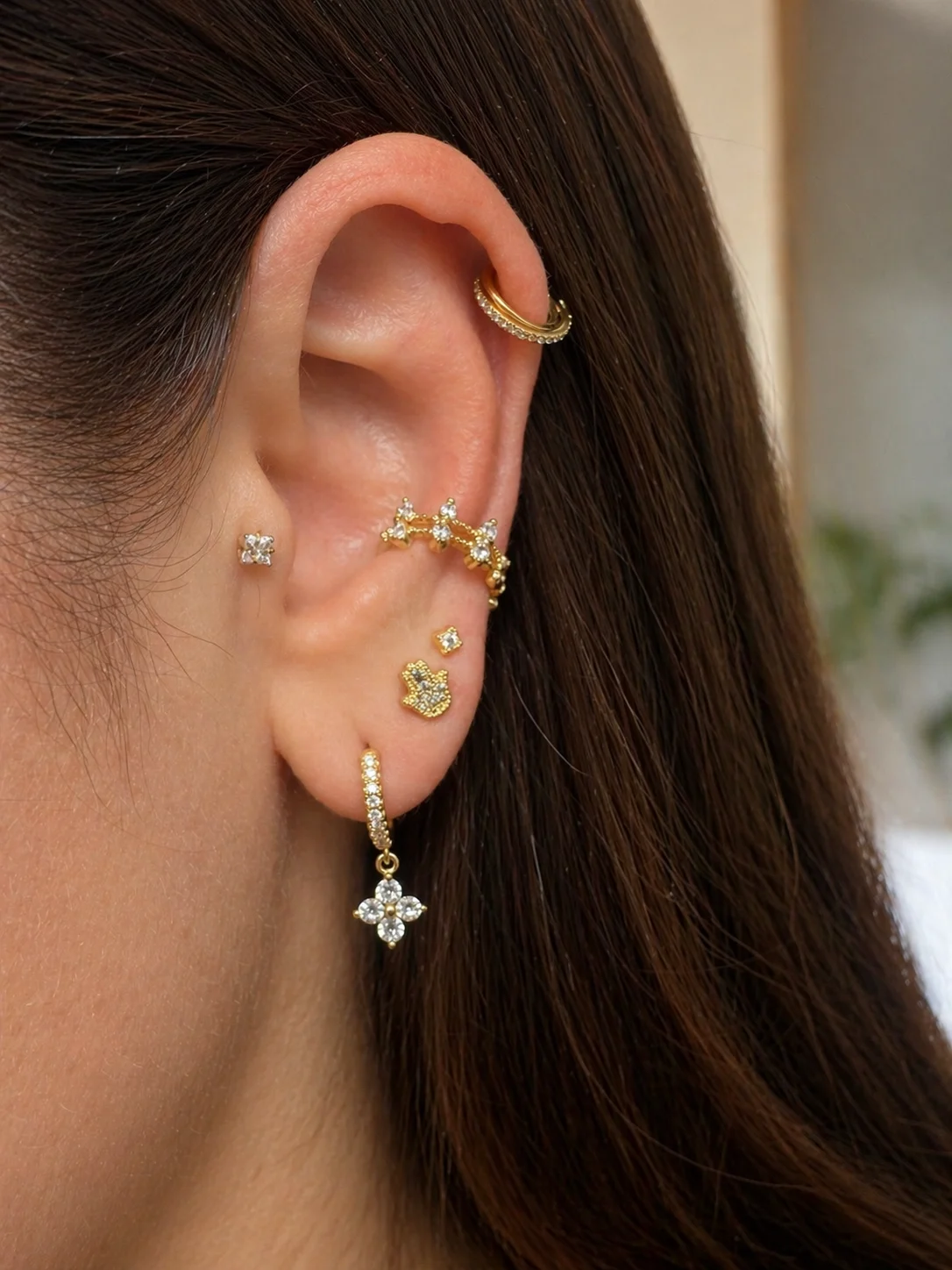 Fabricado en acero inoxidable 316L y decorado con circonitas de brillo sutil, su acabado aporta luz sin resultar excesivo, manteniendo la estética fina y moderna de la colección Nexa. Su tamaño mini lo hace perfecto para combinar con otros piercings y crear composiciones únicas en la oreja.