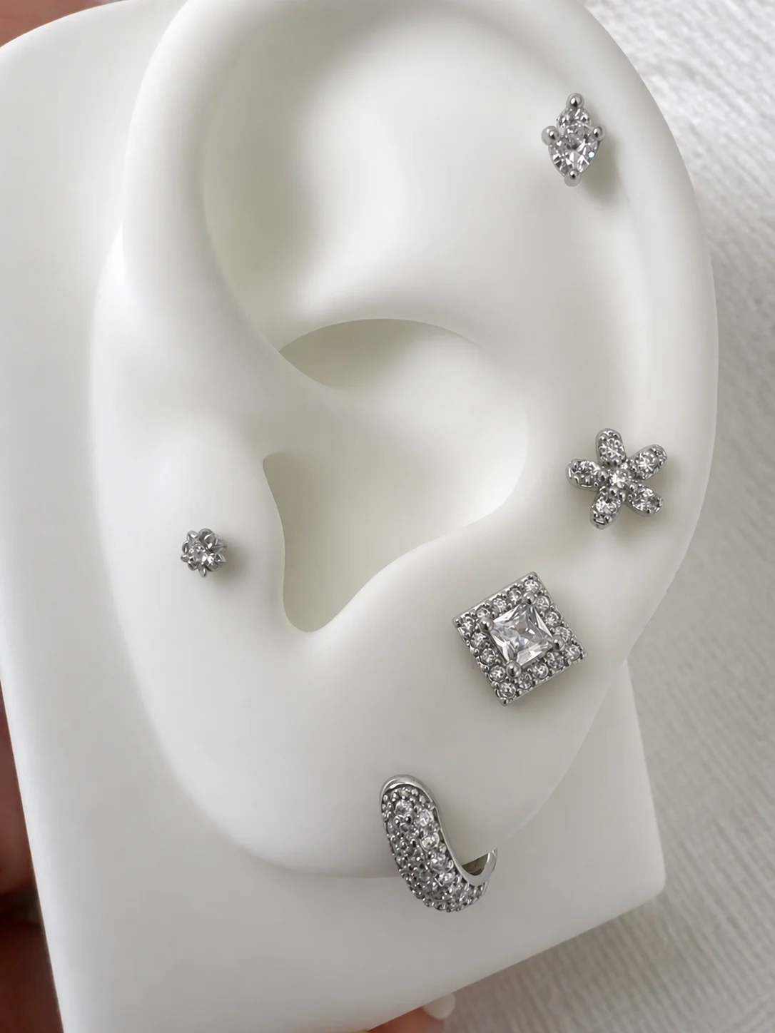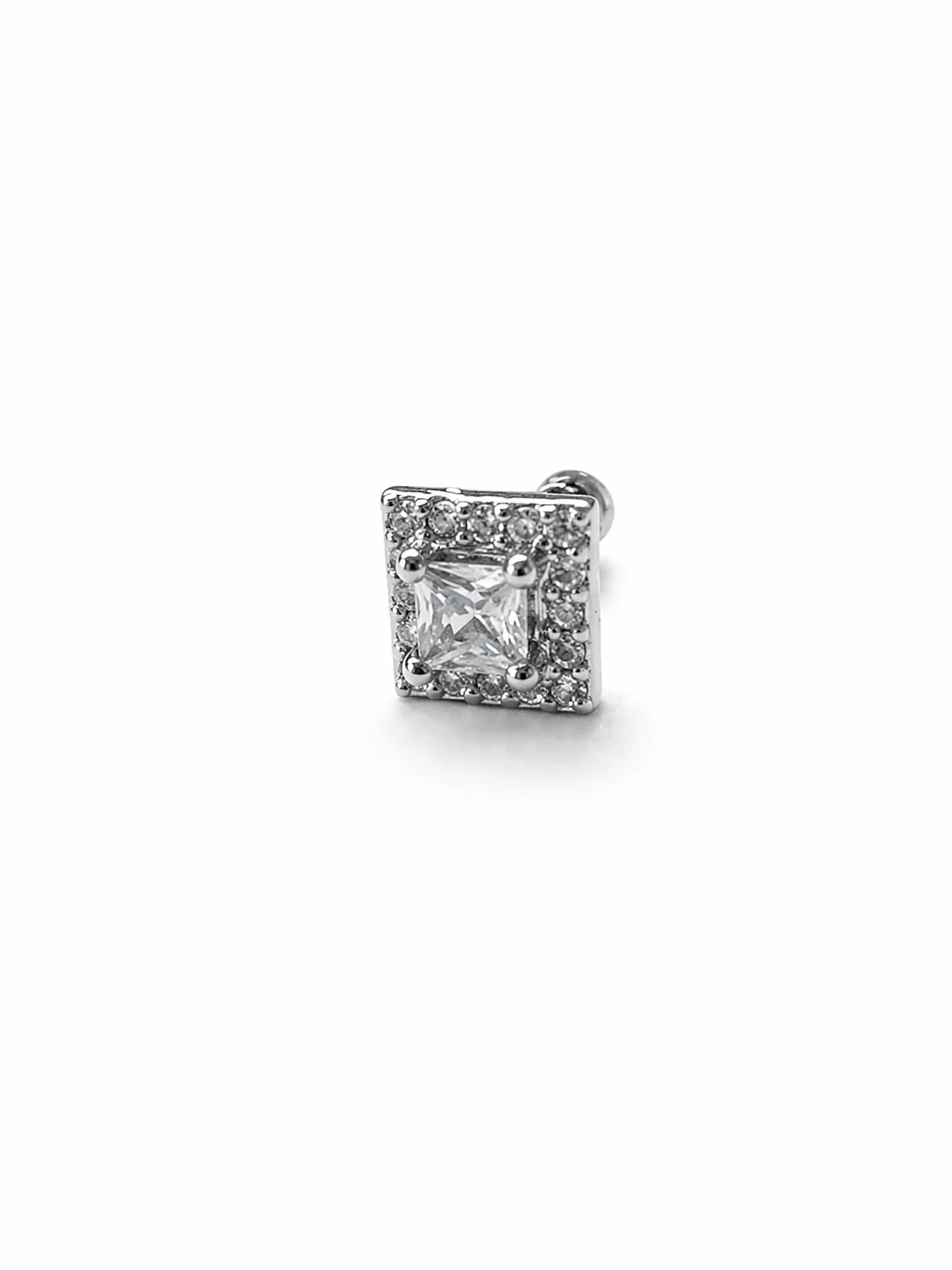 Piercing cuadrado con piedra central tipo princesa y halo de circonitas.