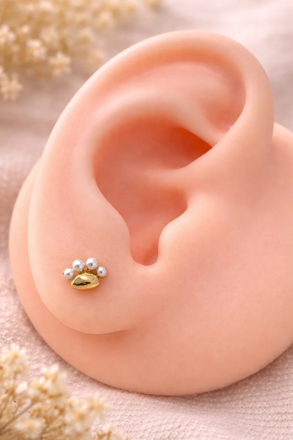 - Pendientes mini en forma de huella con cuatro perlas, elaborados en plata de ley 925 con baño de oro.