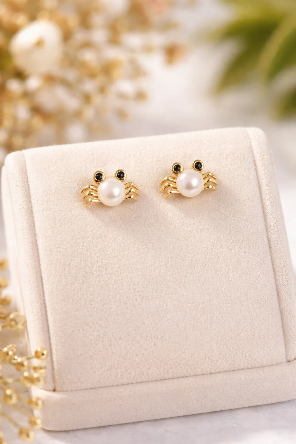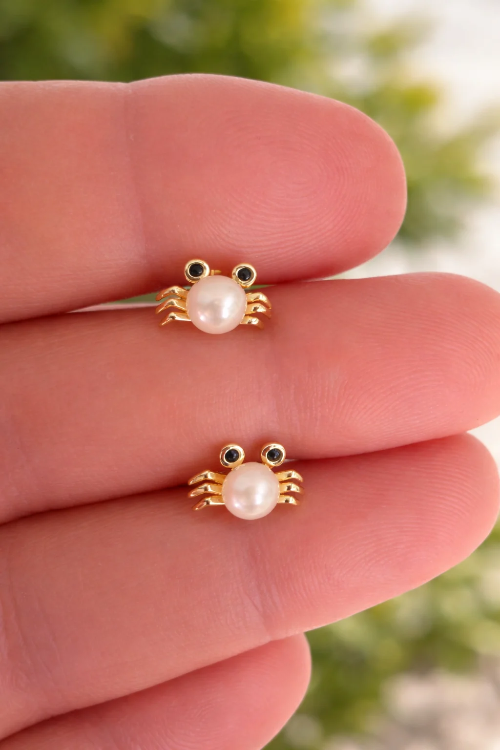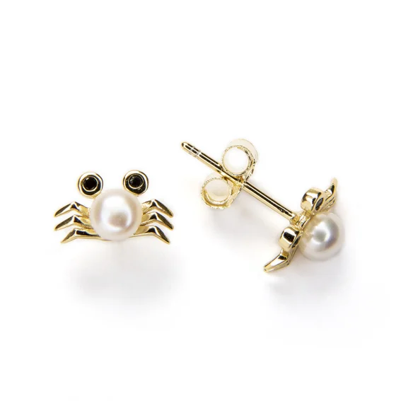 • Pendientes mini cangrejo de plata de ley 925 con baño de oro y perla cultivada de 4 mm.