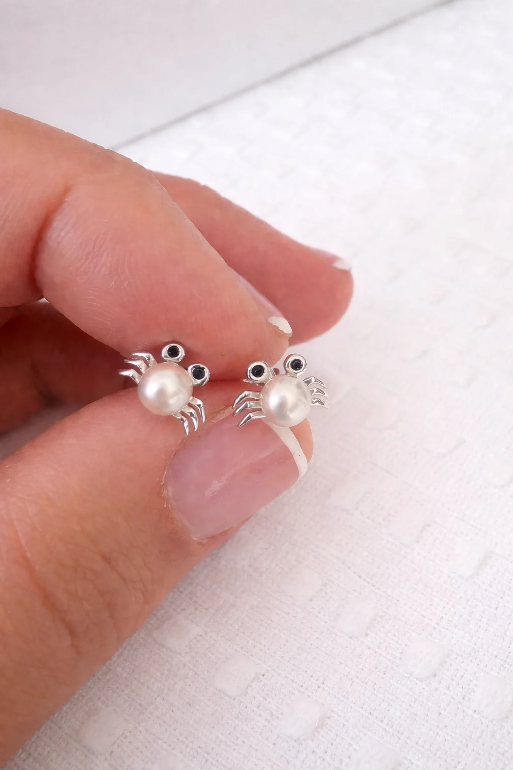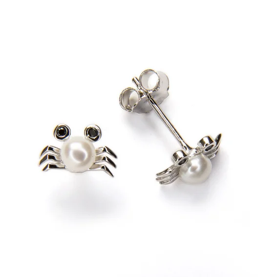 Pendientes mini de plata con diseño de cangrejo y detalle de perla cultivada, perfecta para segundo agujero, o para niñas.