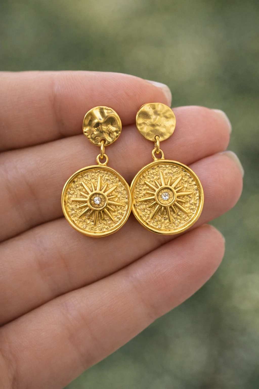 Pendientes dorados con diseño solar en acero inoxidable. Elegantes, ligeros y con un brillo que ilumina cualquier estilo.