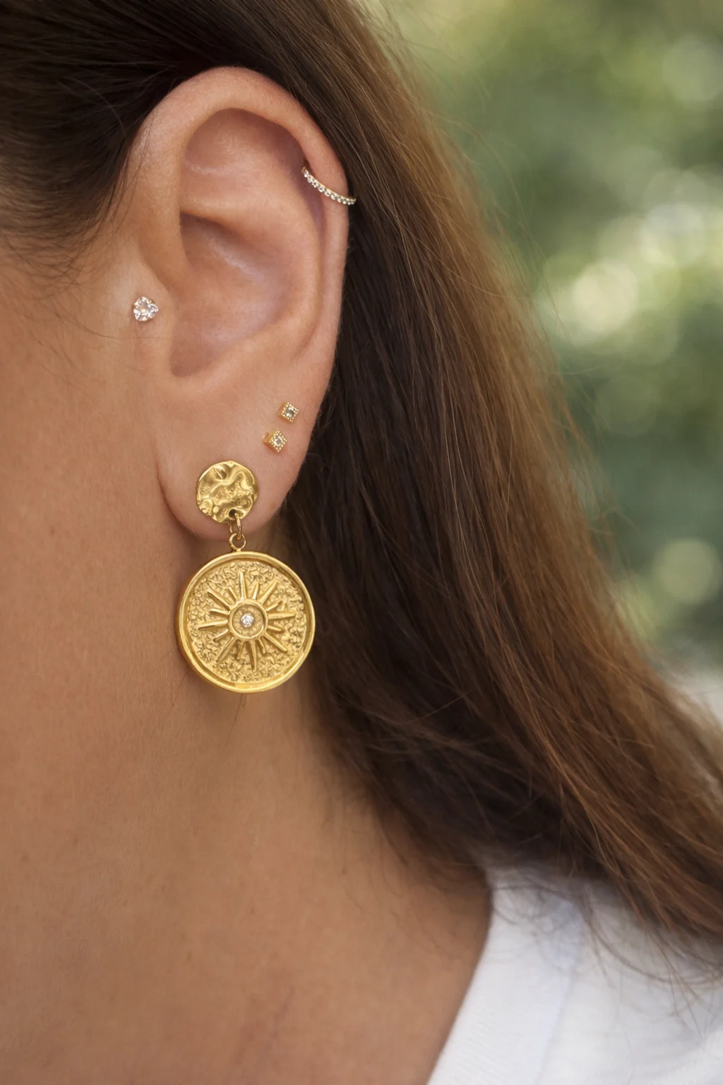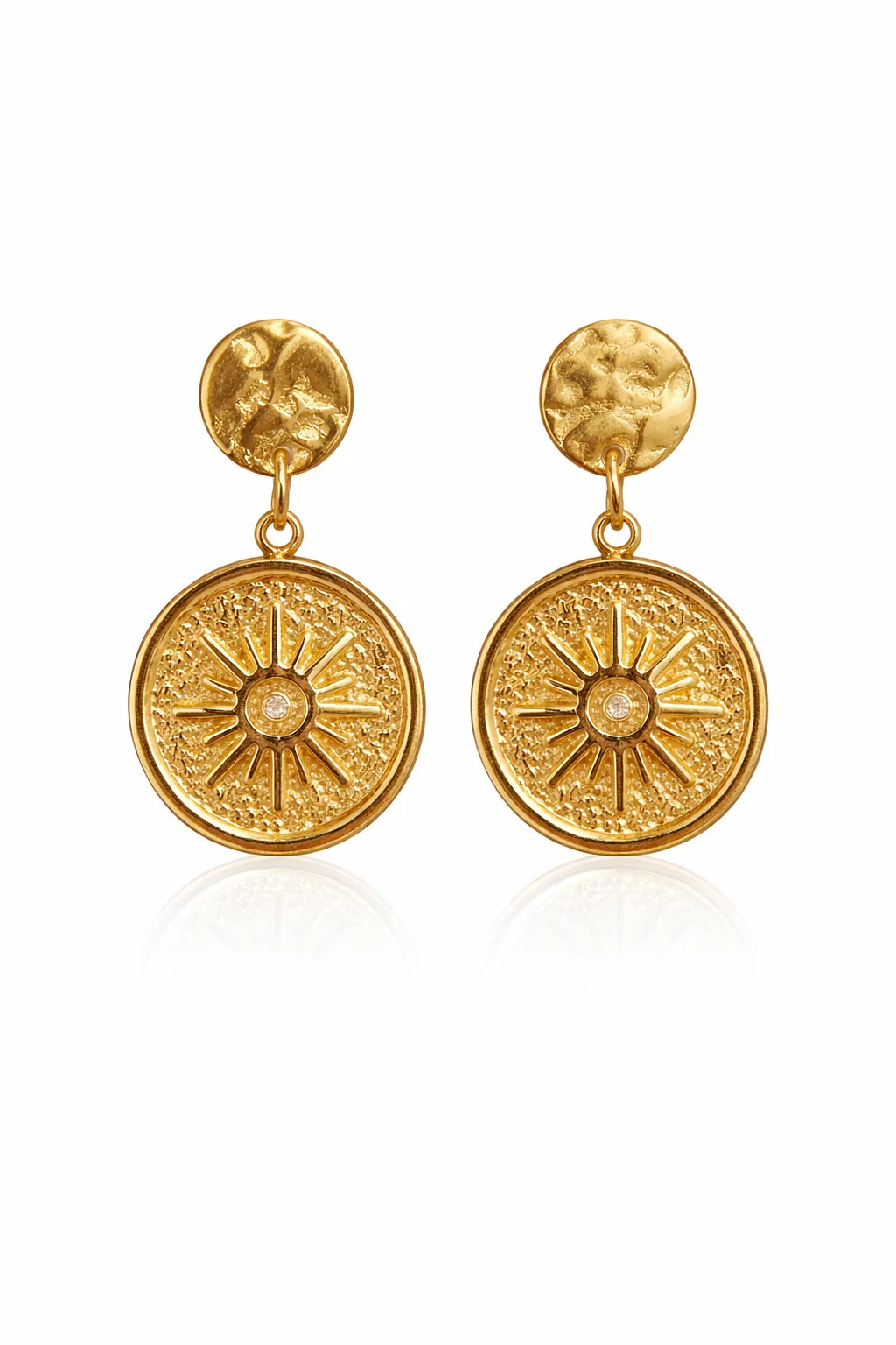 Los pendientes Solaris capturan la esencia de la luz en una joya elegante y contemporánea. Su diseño combina una base texturizada con un colgante circular grabado en forma de sol, creando un juego de reflejos cálidos que aporta luminosidad al rostro.