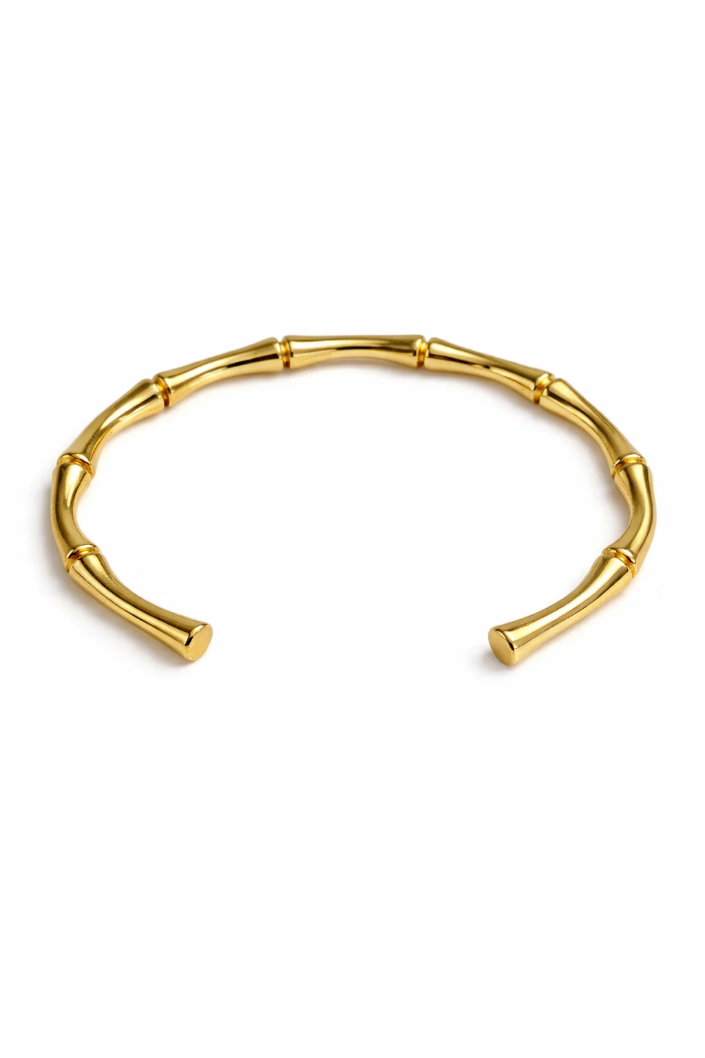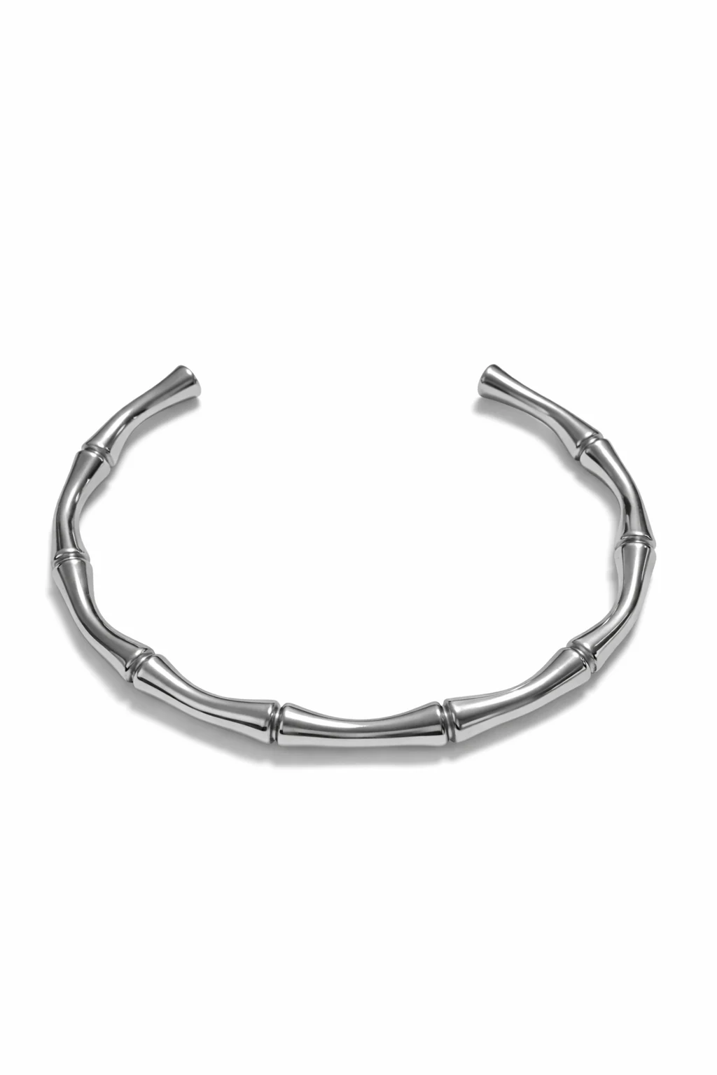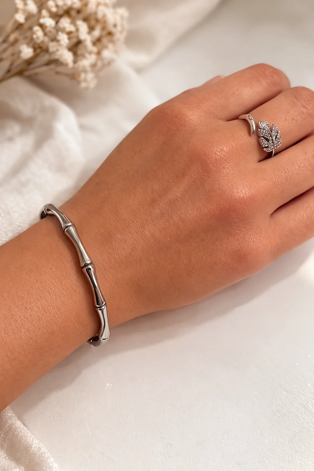 La pulsera Elara es una joya elegante y contemporánea que destaca por su diseño inspirado en las formas naturales del bambú. Su estructura rígida y sus líneas suaves crean un estilo sofisticado y minimalista que aporta un toque moderno a cualquier look.