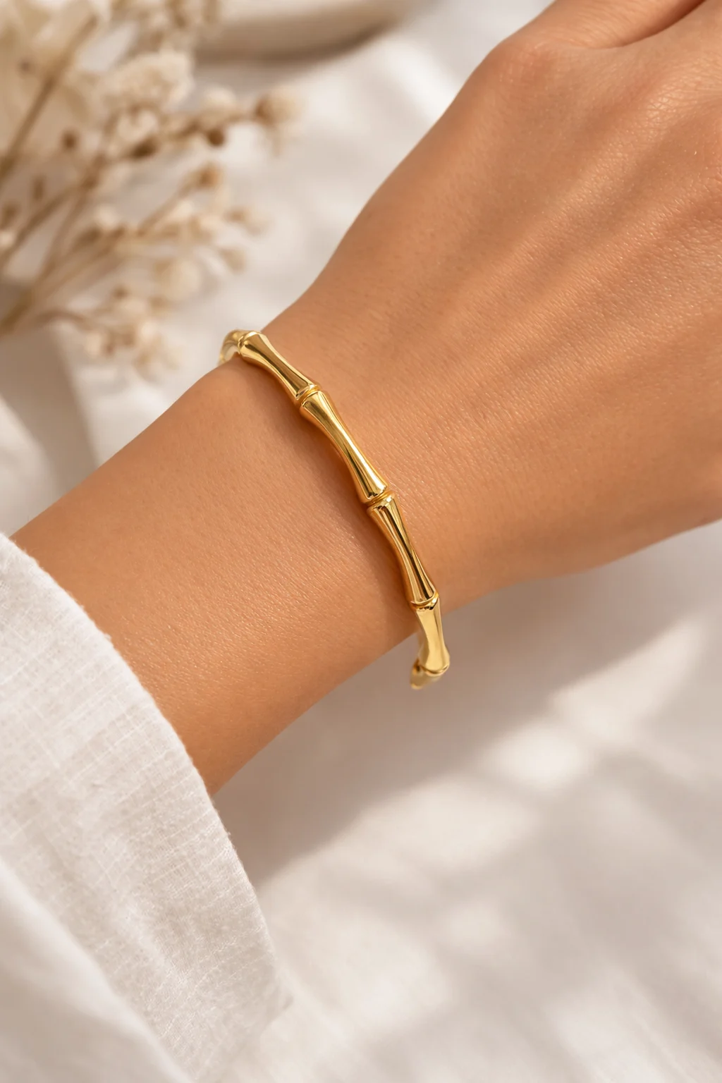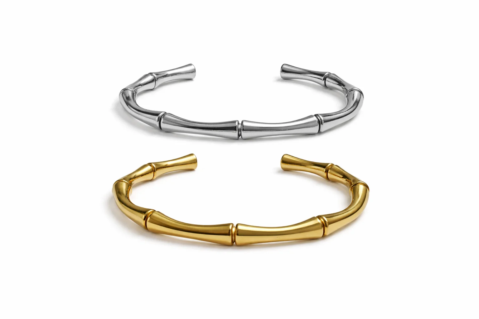 • Pulsera Elara con diseño inspirado en bambú, fabricada en acero inoxidable y disponible en dorado y plateado.