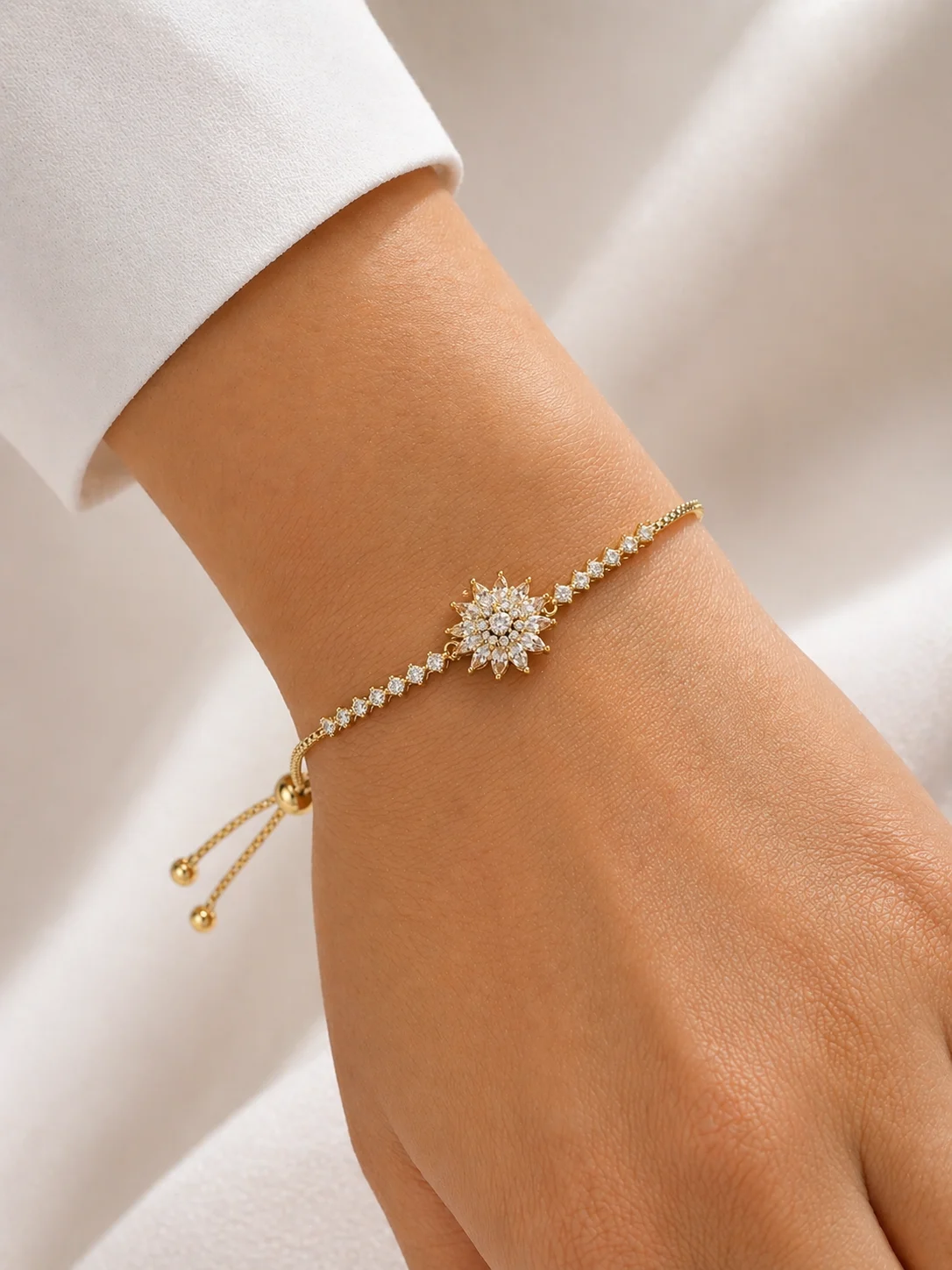 Cada detalle ha sido diseñado para aportar luminosidad y sofisticación, con circonitas que reflejan la luz en cada movimiento. Su estructura ajustable permite adaptarse cómodamente a cualquier muñeca, convirtiéndola en una pieza práctica para el día a día sin renunciar al estilo.