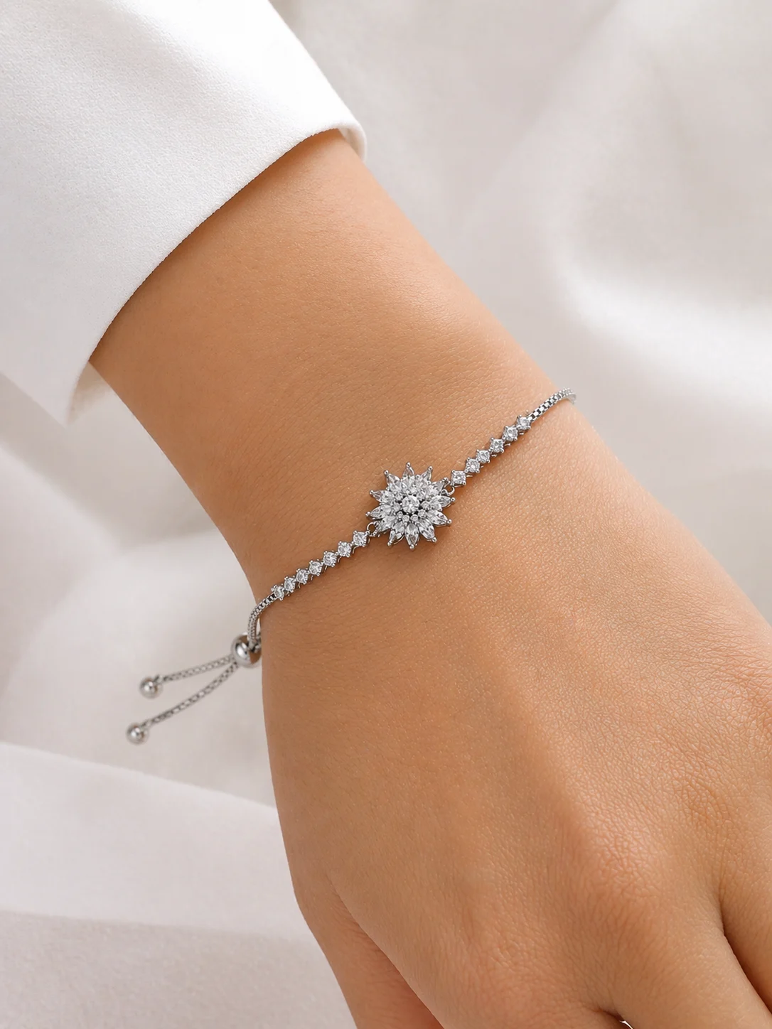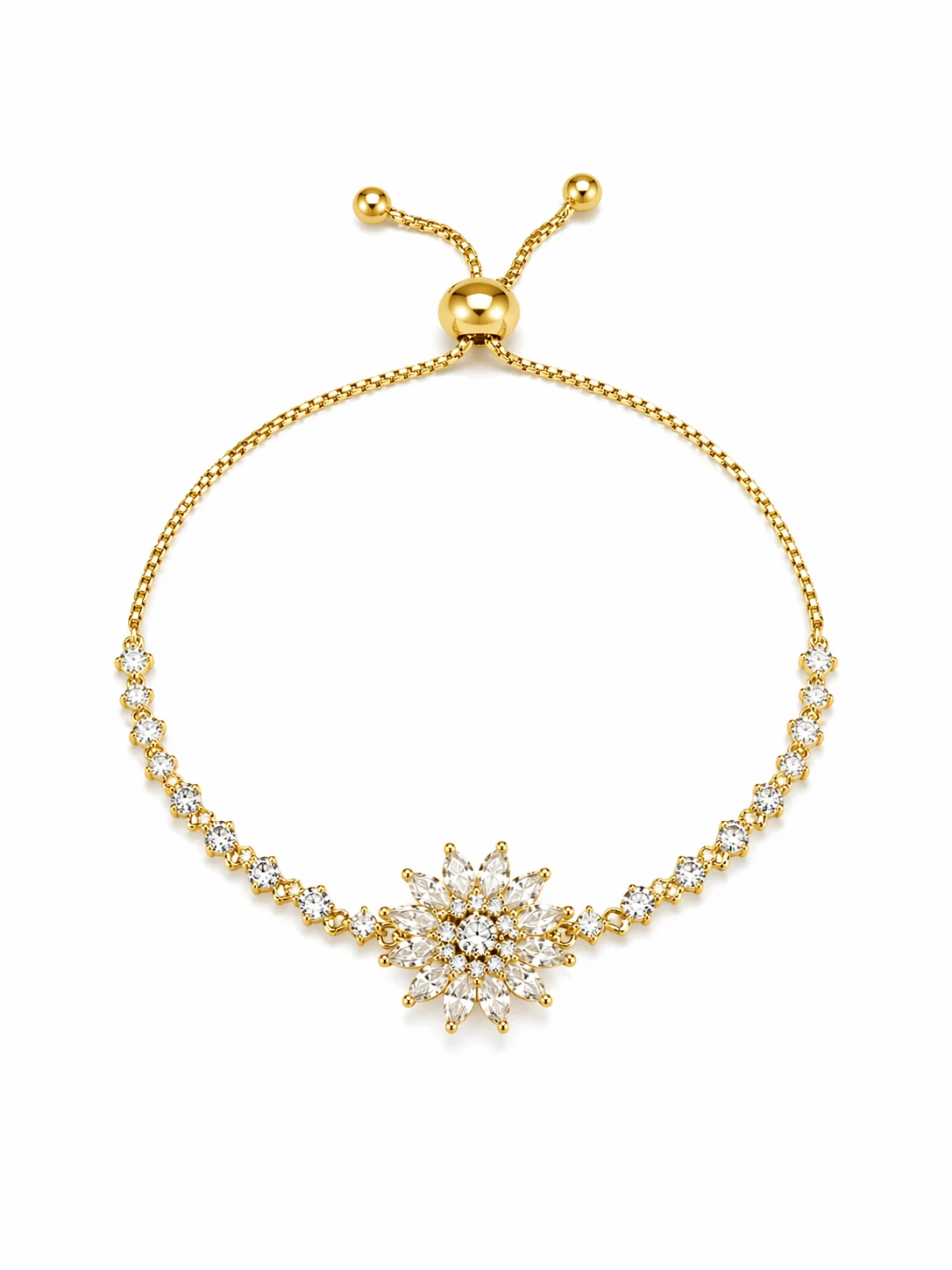 - Pulsera ajustable en acero con circonitas y diseño de girasol giratorio anti estrés.