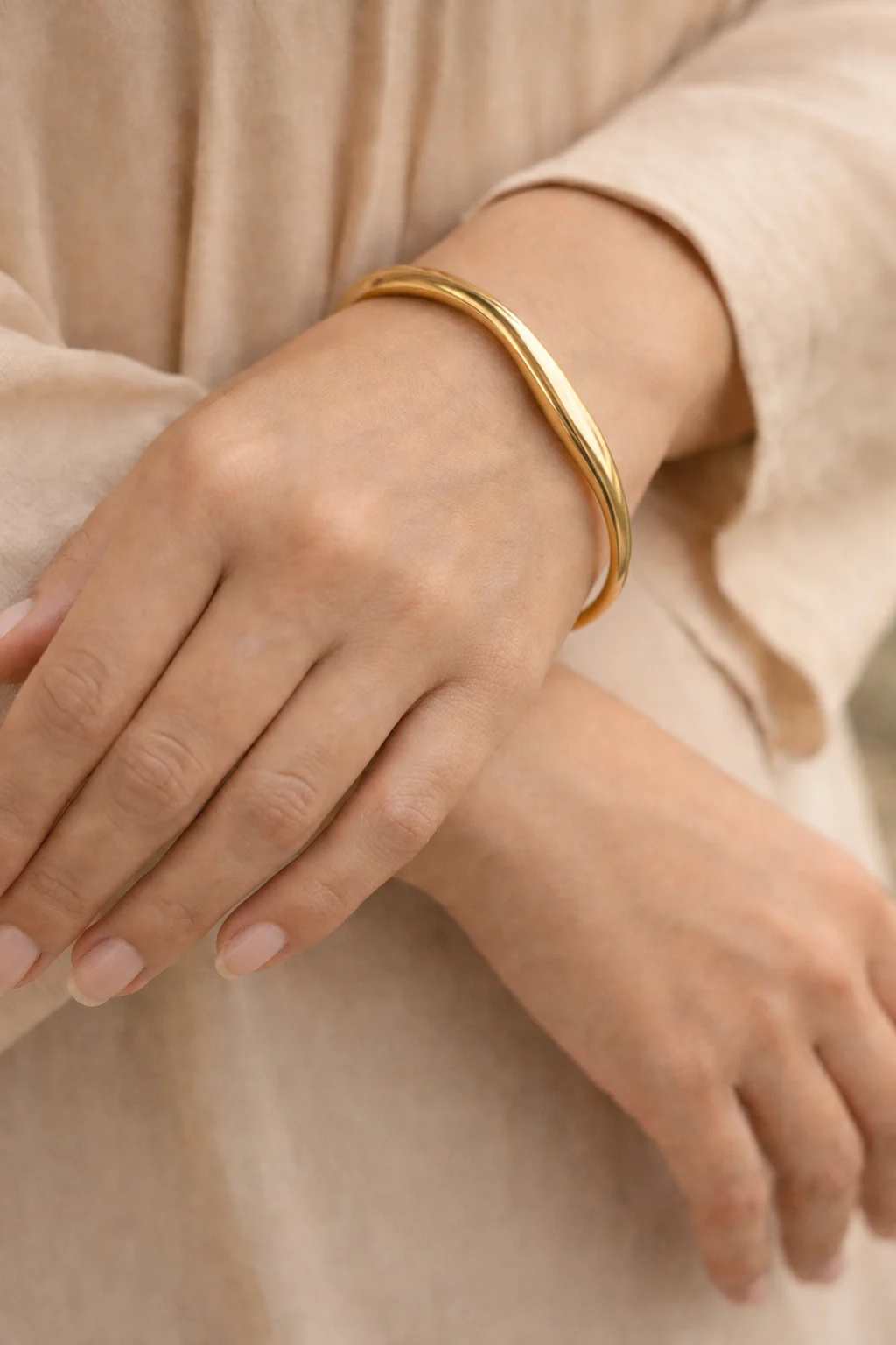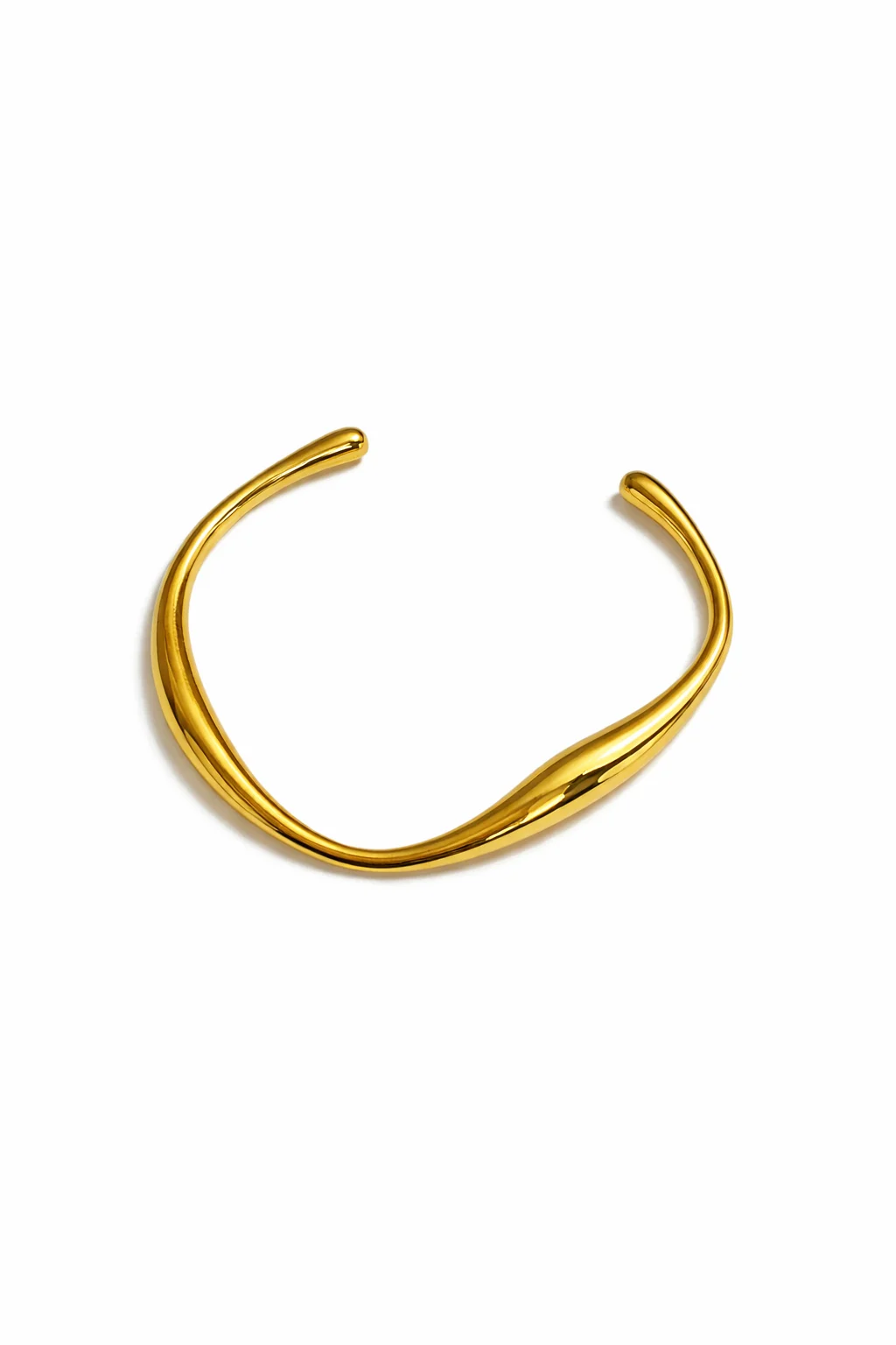 Pulsera Lume es una pulsera rígida abierta de acero inoxidable dorado, ajustable para encajar cómodamente en cualquier muñeca.