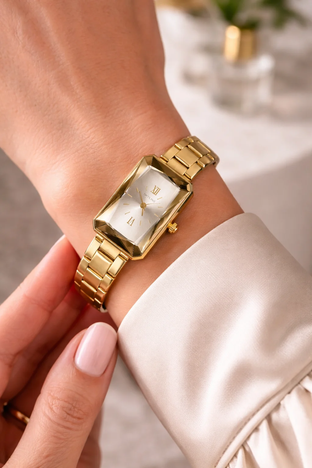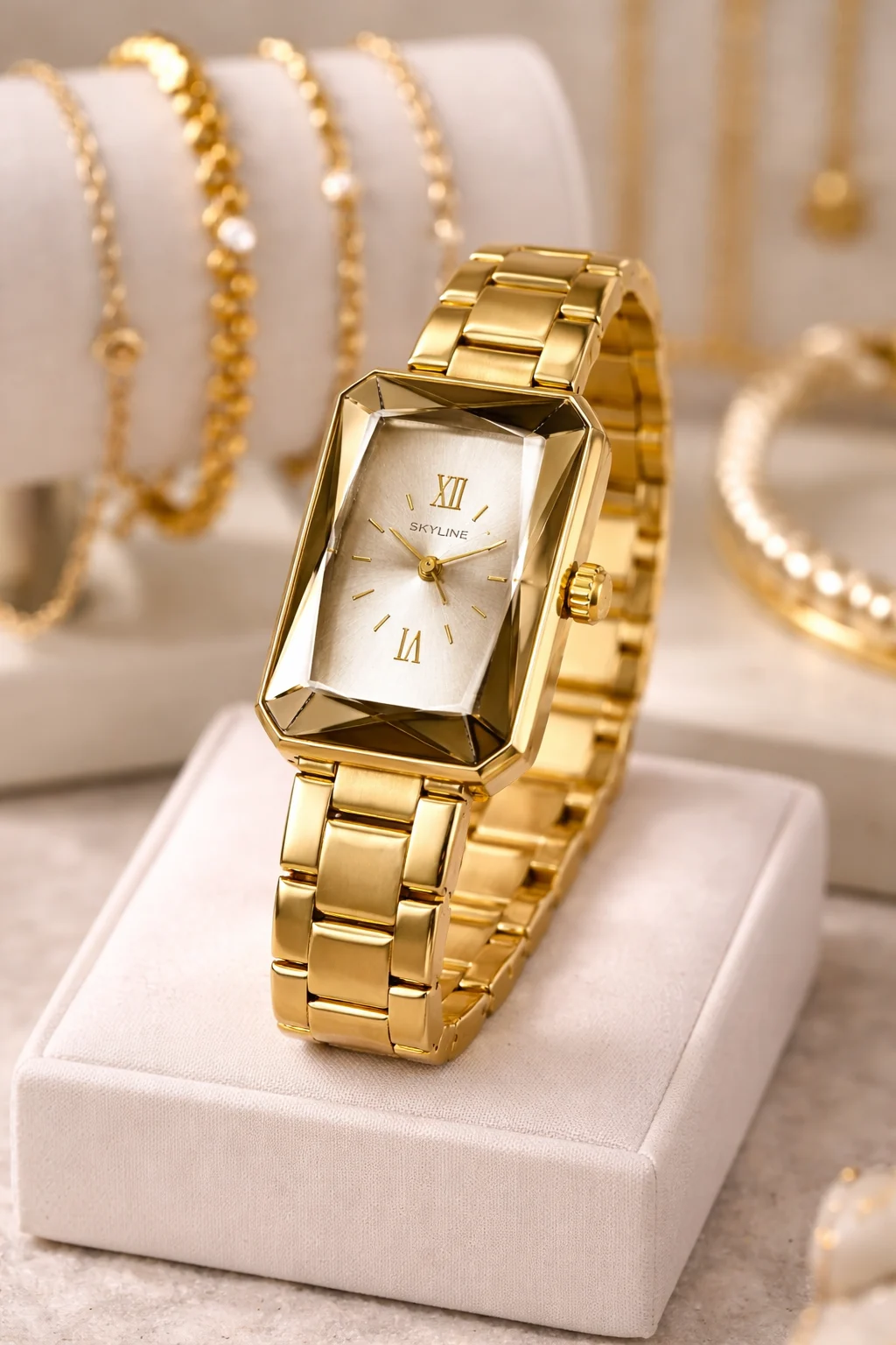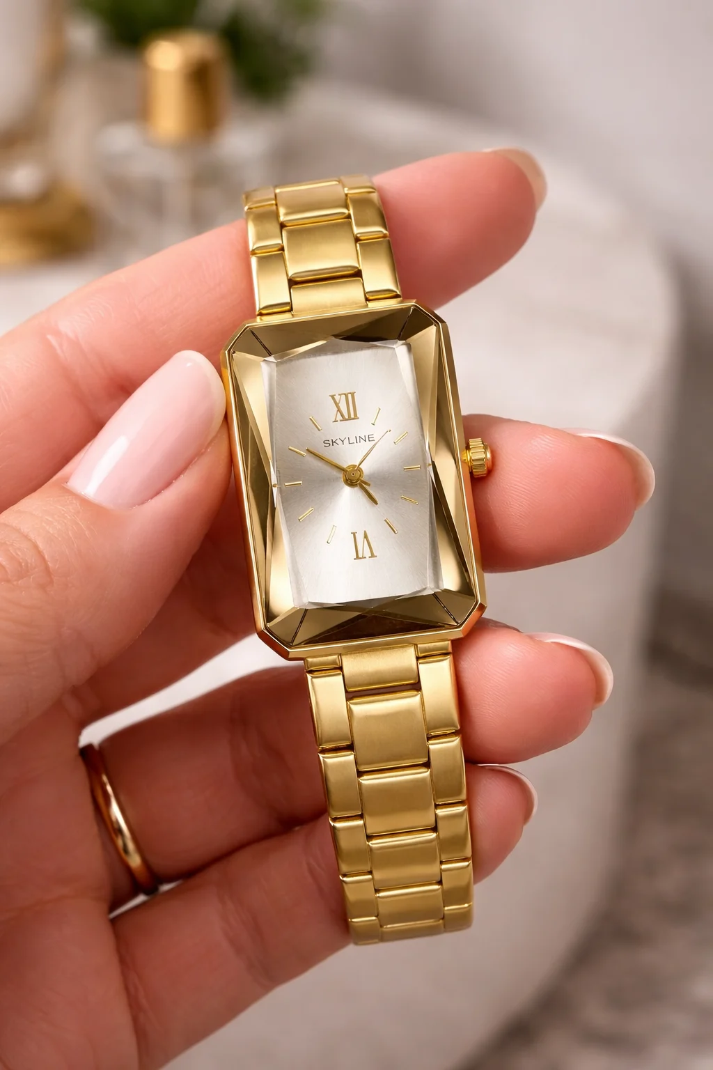 - Skyline Glace Gold es un reloj femenino de diseño rectangular y líneas limpias que transmite elegancia moderna.