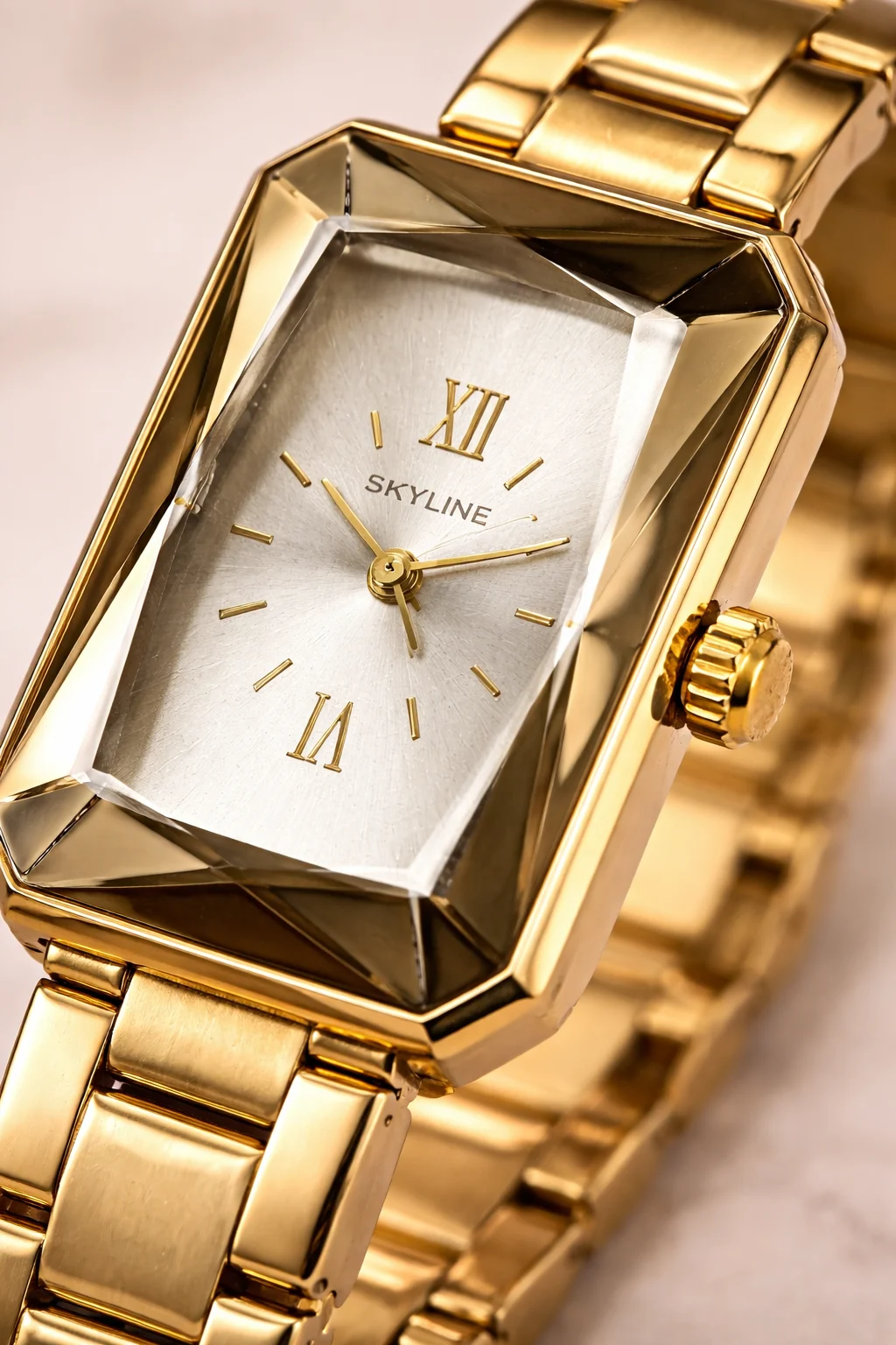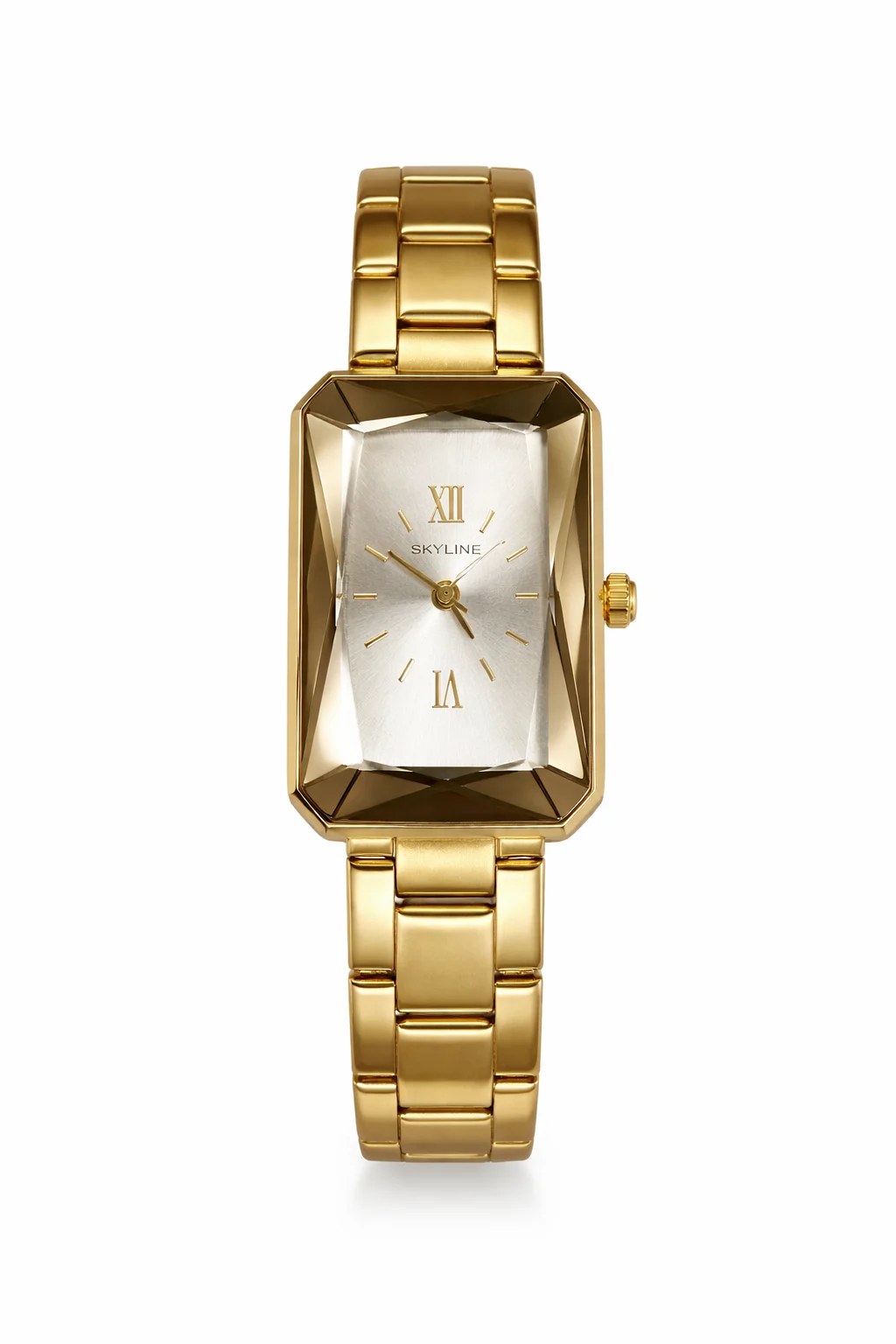 El Skyline Glace Gold destaca por su diseño elegante y femenino. Su caja rectangular con líneas definidas crea una pieza moderna y sofisticada que aporta un toque refinado a cualquier estilo.