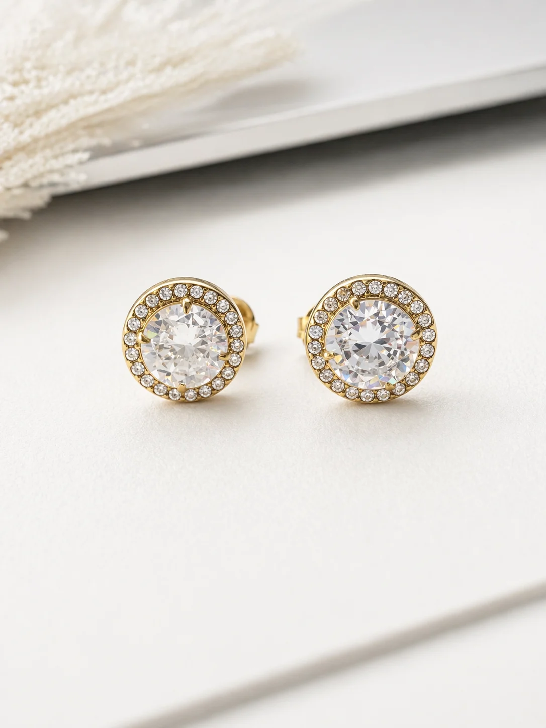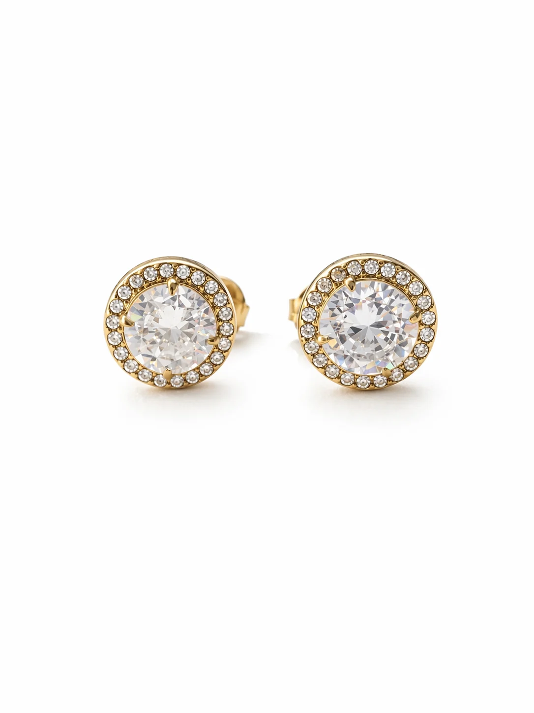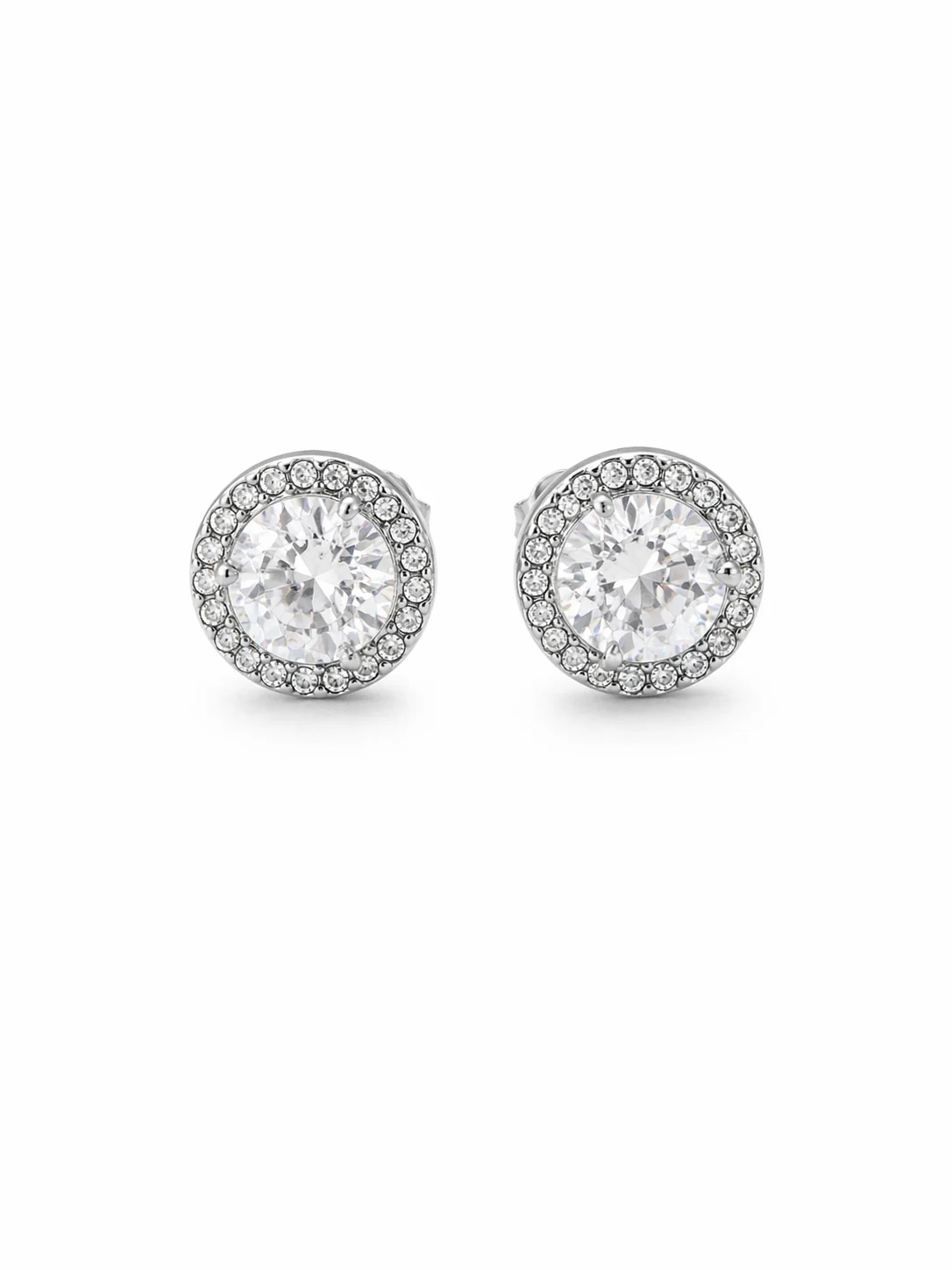 - Pendiente tipo stud de 10 mm en acero inoxidable con circonita central y halo de brillo.