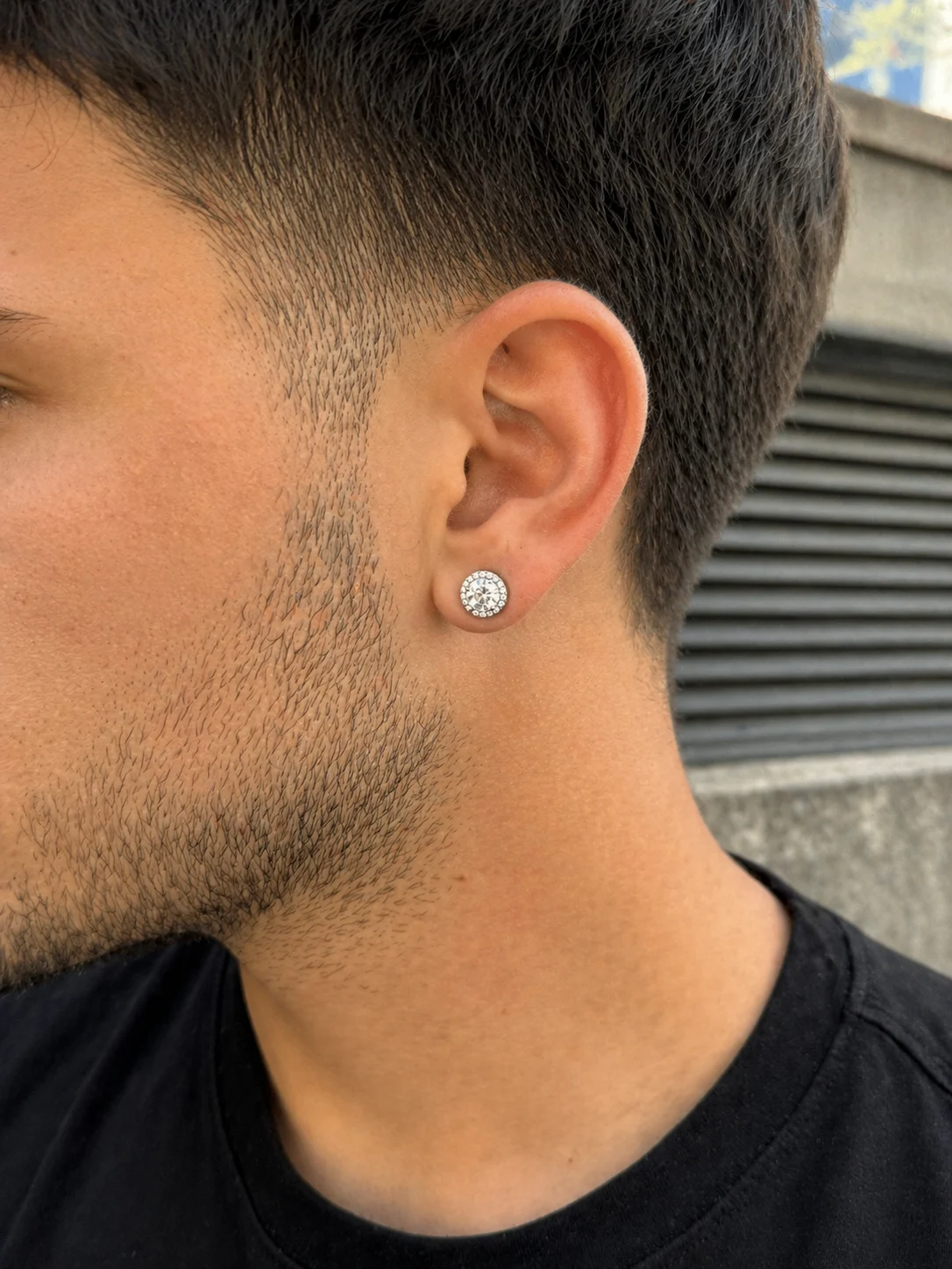 Este pendiente tipo stud combina una piedra central de gran tamaño con un halo de circonitas que aporta luz sin resultar excesivo. Su diámetro de 10 mm le da presencia en la oreja, convirtiéndolo en una pieza protagonista dentro de cualquier look urbano.